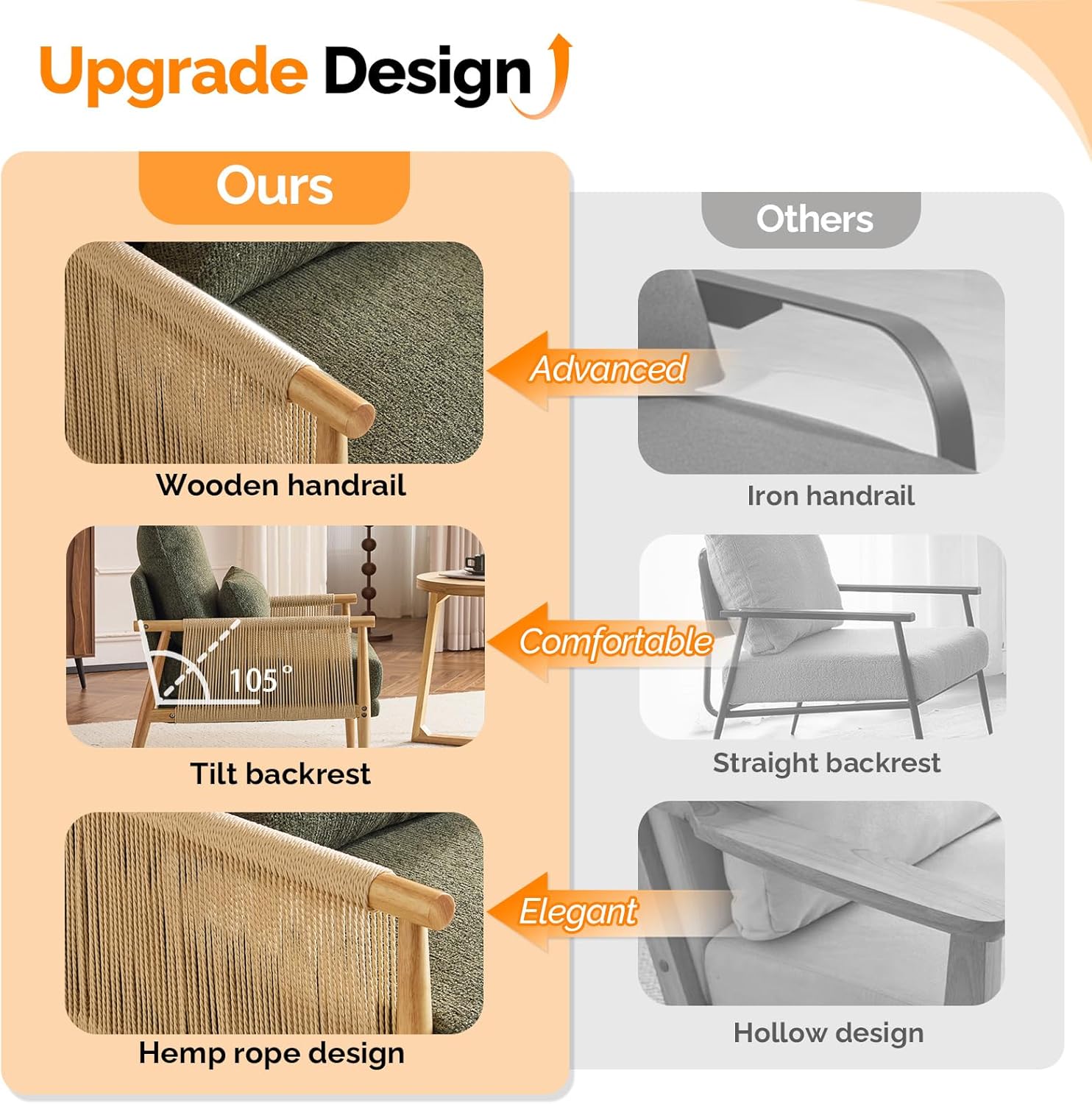 - Braid Design : The Boho-inspired Braid Accent Chair showcases elegant paper cord weaving across its angled armrests. Its thoughtful design combines comfort and style with a medium-height backrest and plush cushioning. This piece seamlessly blends casual and sophisticated interior comfort, perfect for home decoration. The two chairs will be shipped in separate packages. Please note that they may not arrive at the same time.