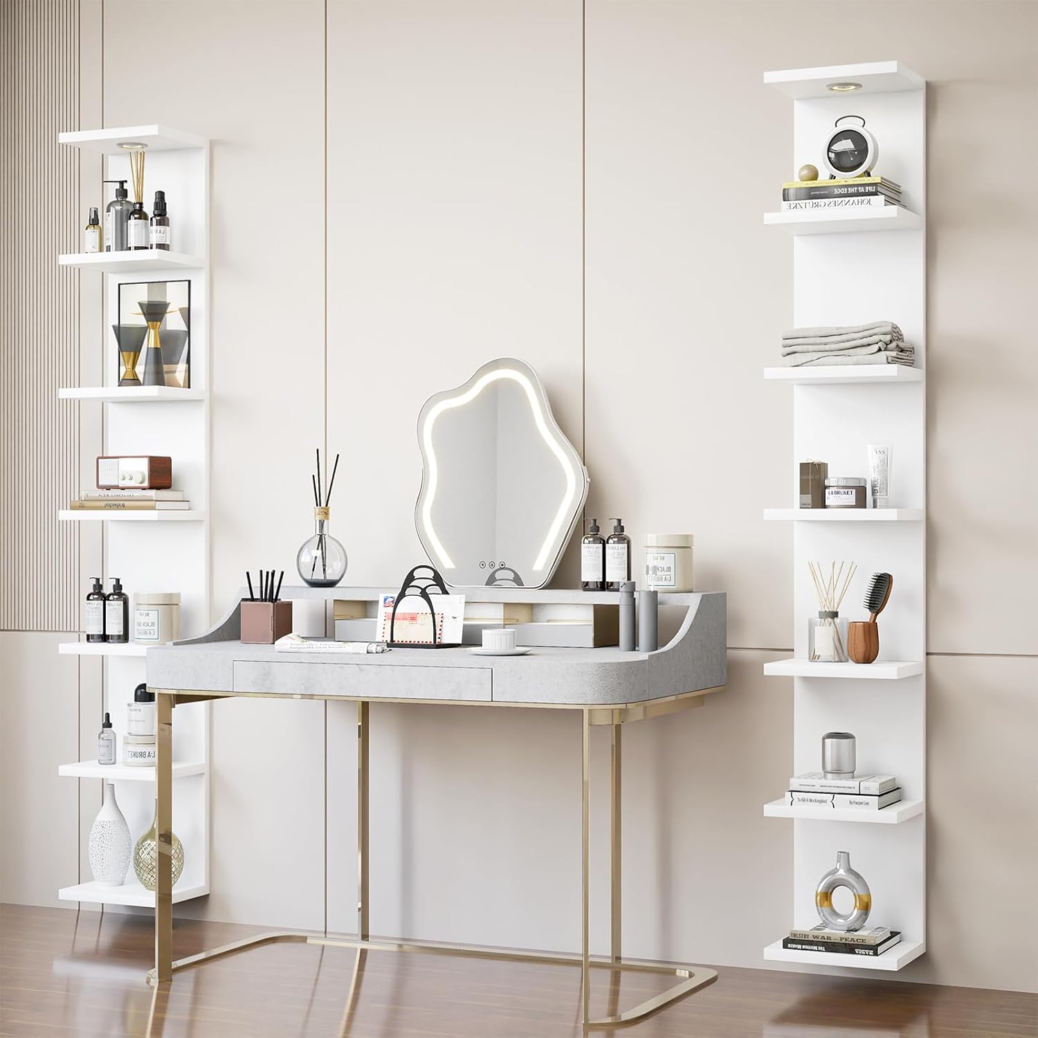 - ăSpace-saving & Adjustable LEDă- This 7 tier vanity shelves for wall combines functionality and modern aesthetics, vertically with the height of 6.4Ft. It perfectly adapts to long narrow spaces, creatively saves space and flexibly adapts to different items needs. The adjustable LED light strips provide a variety of colors and brightness options, allowing you to find the items you need easily in the dark, making it easy to illuminate displayed items (such as books, decor) and highlight the display effect