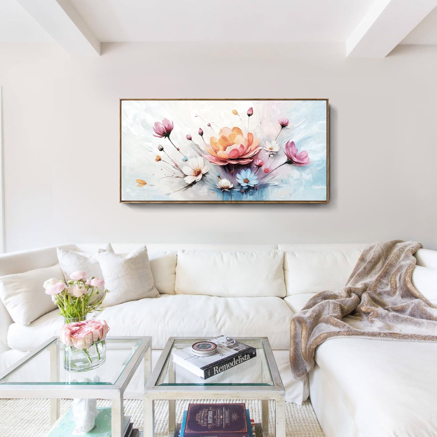 amatop Framed Floral Canvas Wall Art Picture Large Pink Blue Abstract Bloom Bouquet Print with Daisy Peony Elegant Botanical Nature Artwork for Living Room Bedroom Dining Room Entryway Decor 48x24 inch