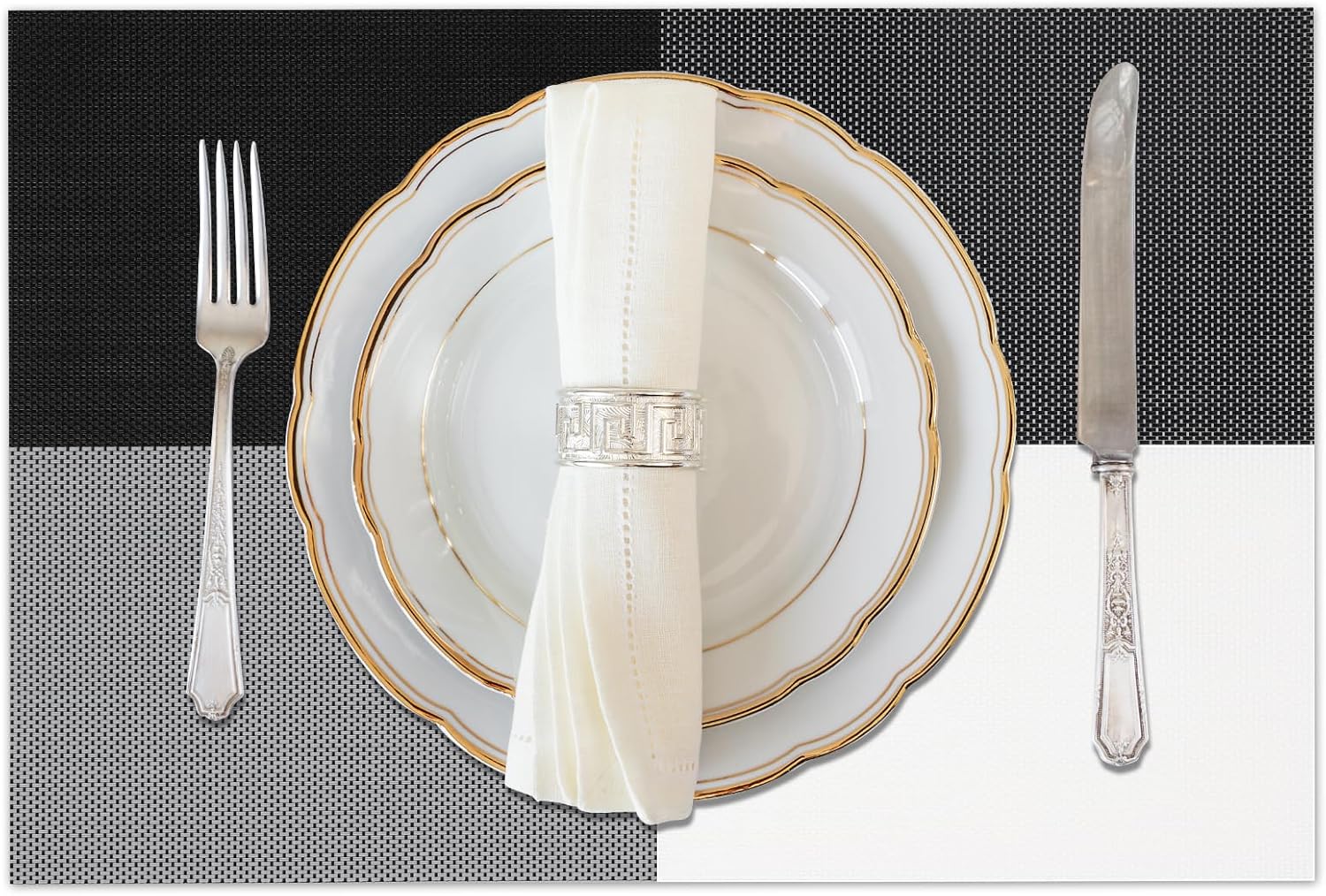 Vinyl Plastic Placemats Set of 4 Washable Heat Resistant Non-Slip Elegant Indoor Outdoor Kitchen Dining PVC Woven Table Place Mats (Black White Lattice Block)