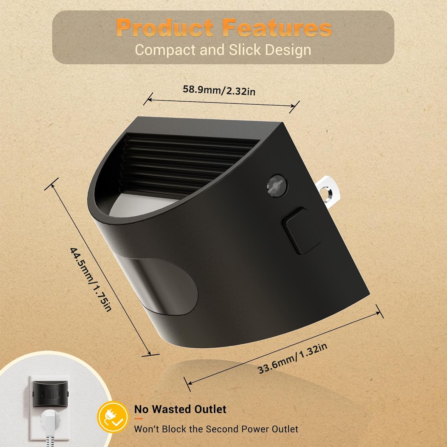 - Modern Plug-In Night Light Design:Featuring a sleek black minimalist frame, this modern night light adds a touch of style to your home while maintaining practicality. Its compact design ensures it does not block the bottom outlet, allowing other devices to be plugged in simultaneously, making it both stylish and functional