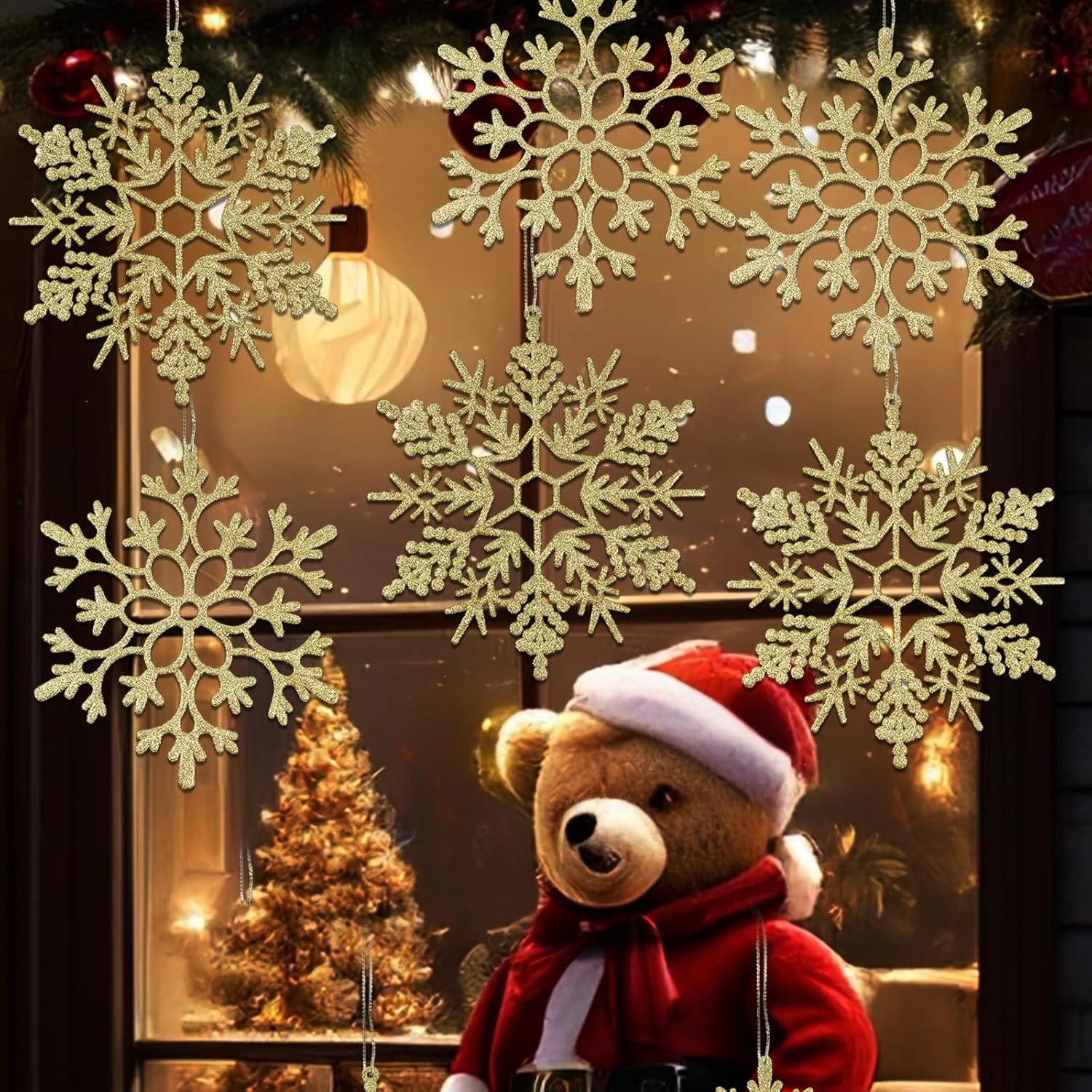 - Designed for Hanging: Each gold glitter snowflakes tree ornaments features a pre-drilled hole at the top, specially designed for Christmas hanging decoration. Simply use the included rope to hang them effortlessly on Christmas trees, walls, ceilings, windows, fireplaces, porches, mantels, doors, bedrooms, and more