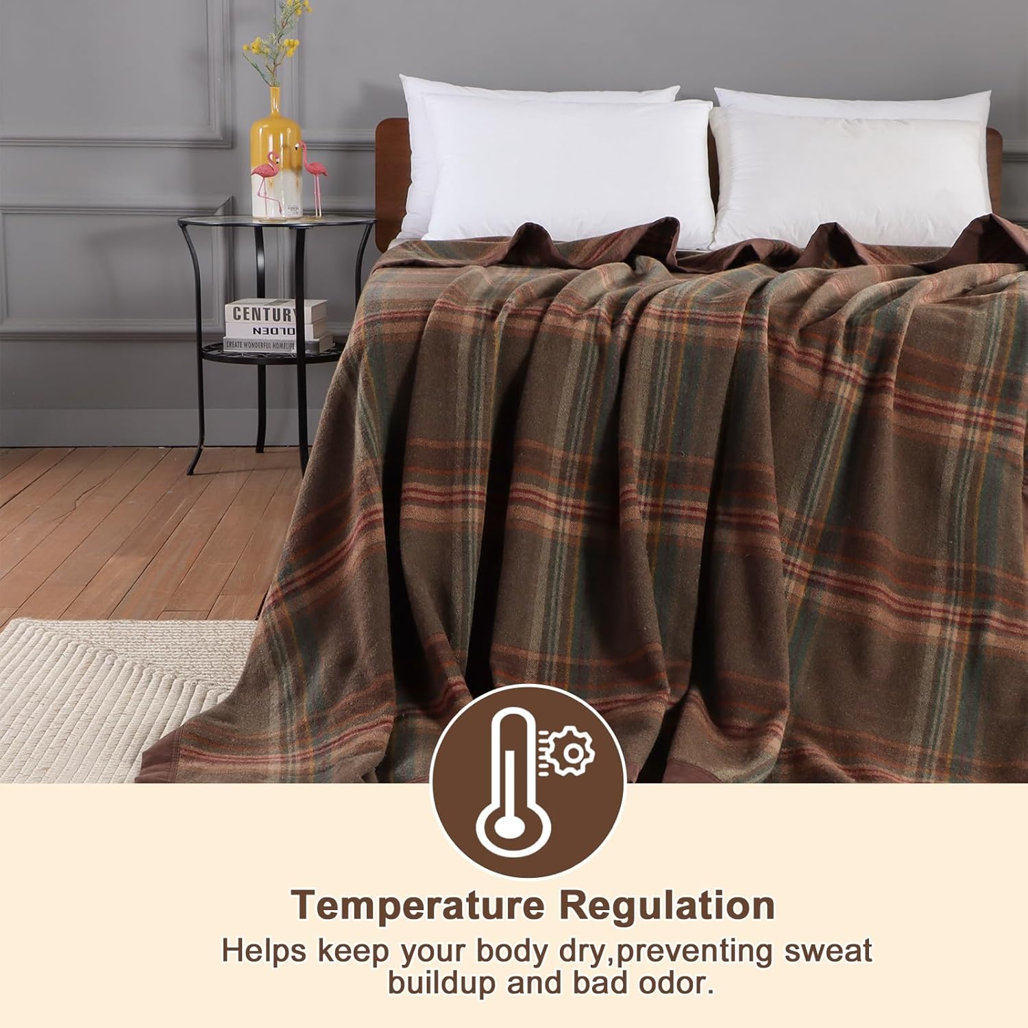 YOUR MOON 100% Pure Merino Wool King Size, Australian Organic Natural Wool Blanket, Hypoallergenic Wool Blanket for Bed, Medium Weight(Plaid Brown, 90 * 108)