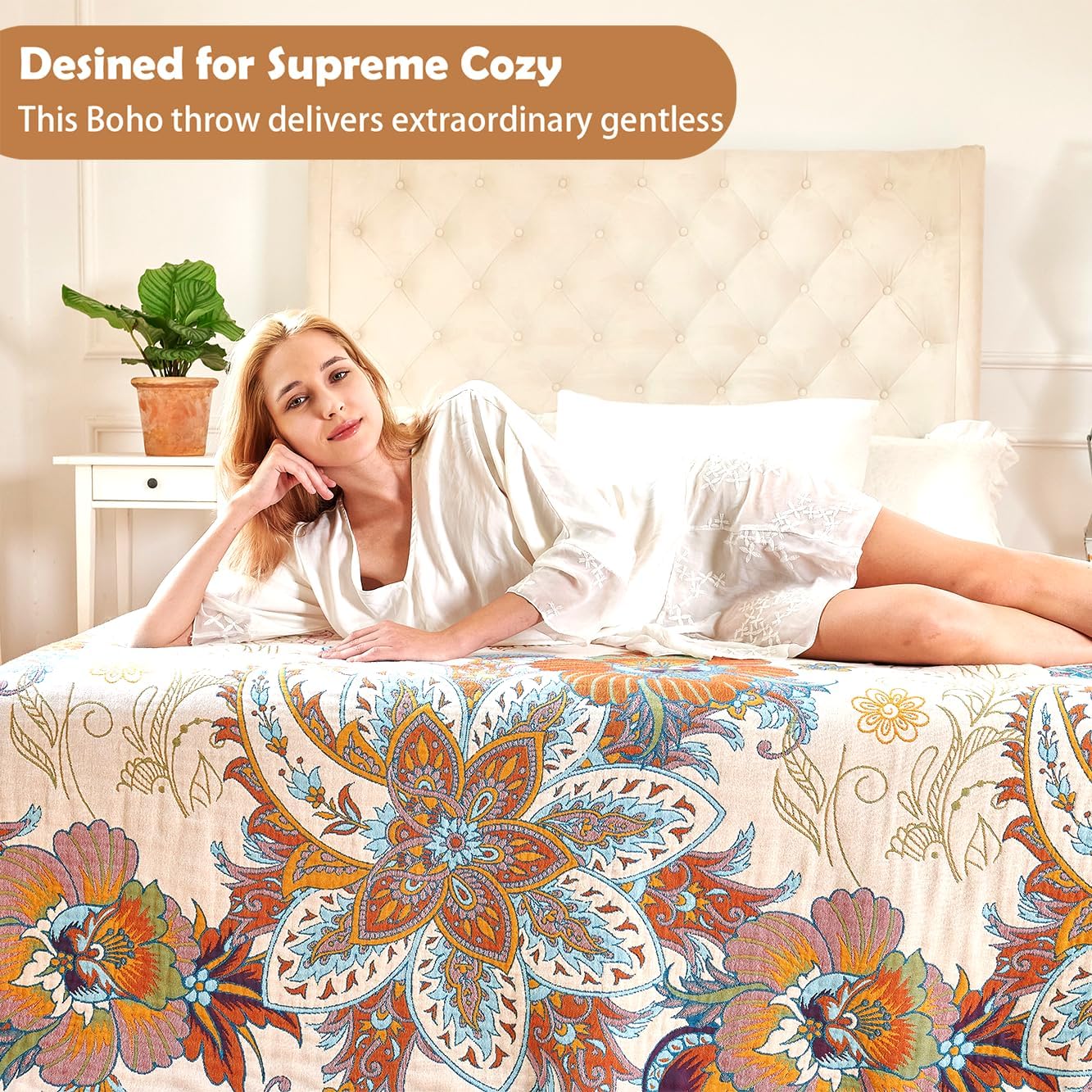 - PREMIUM 100% COTTON CONSTRUCTION: Crafted with exclusive 4-layer breathable cotton fibers in pure natural structure, premium cotton that delivers a baby-soft Class A texture,our boho throw blanket ensures superior softness & temperature regulation. Measuring 50" x 60" 1.6lb