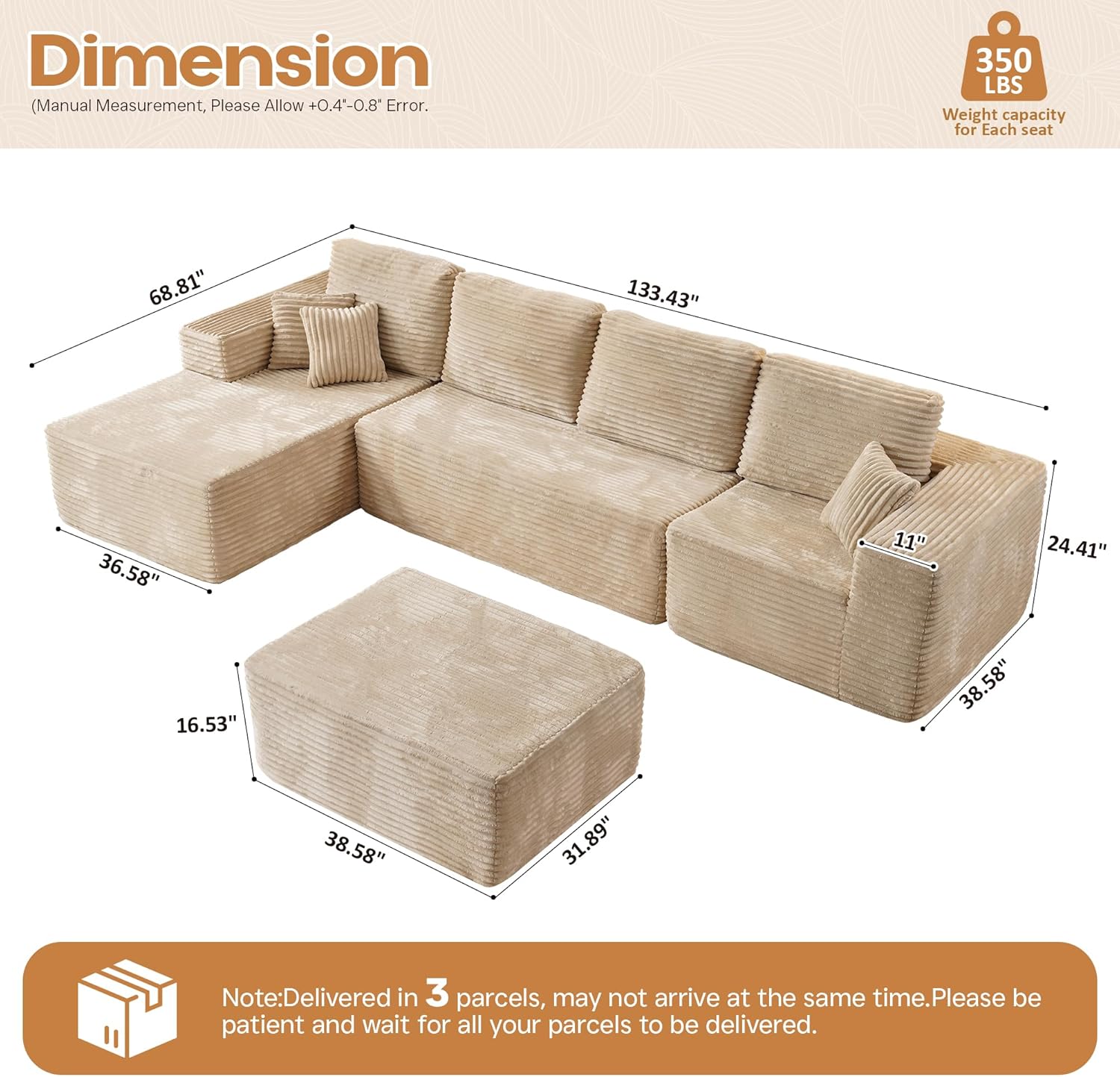 Cloud Sectional Couches for Living Room,U Shaped Modular Sofas No Assembly,133x68 Inches Plush Corduroy Oversized Floor Couch Set with Deep Seat Chaise,Beige