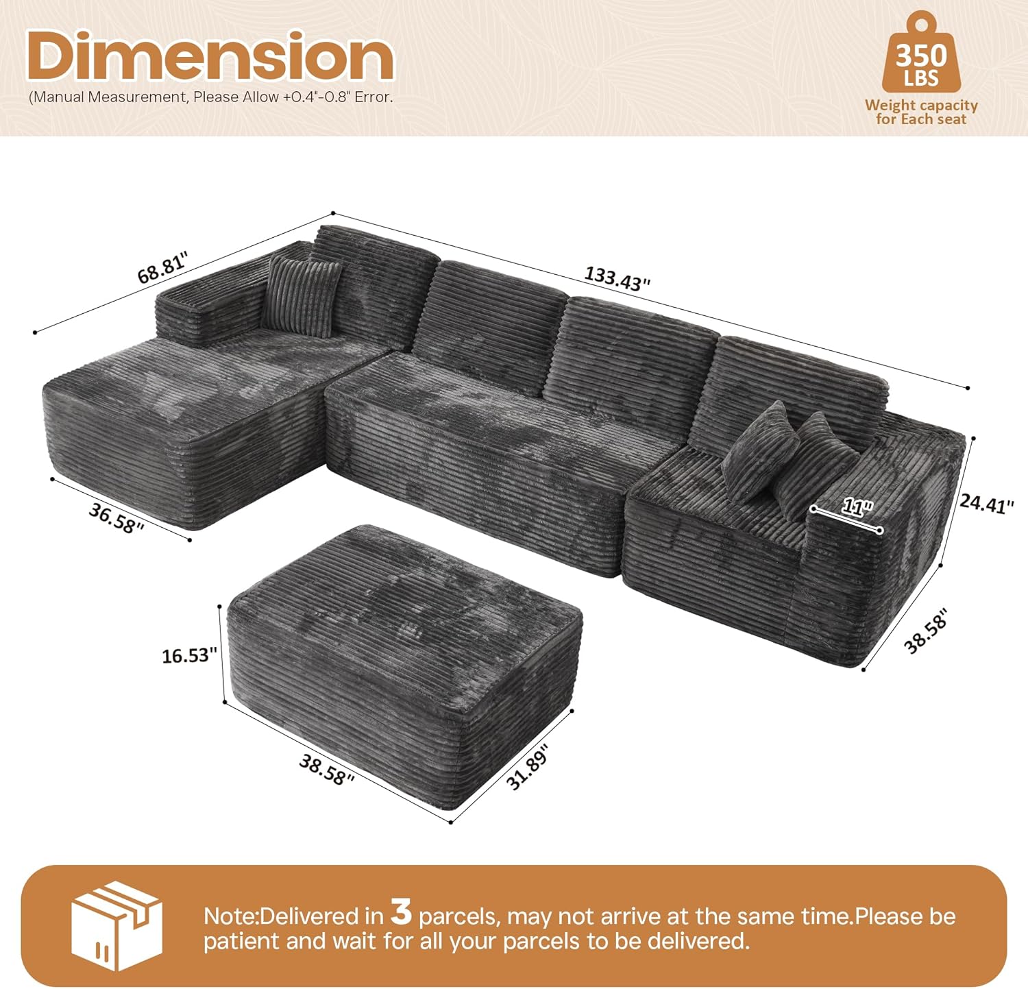 Cloud Sectional Couches for Living Room,U Shaped Modular Sofas No Assembly,133x68 Inches Plush Corduroy Oversized Floor Couch Set with Deep Seat Chaise,Grey