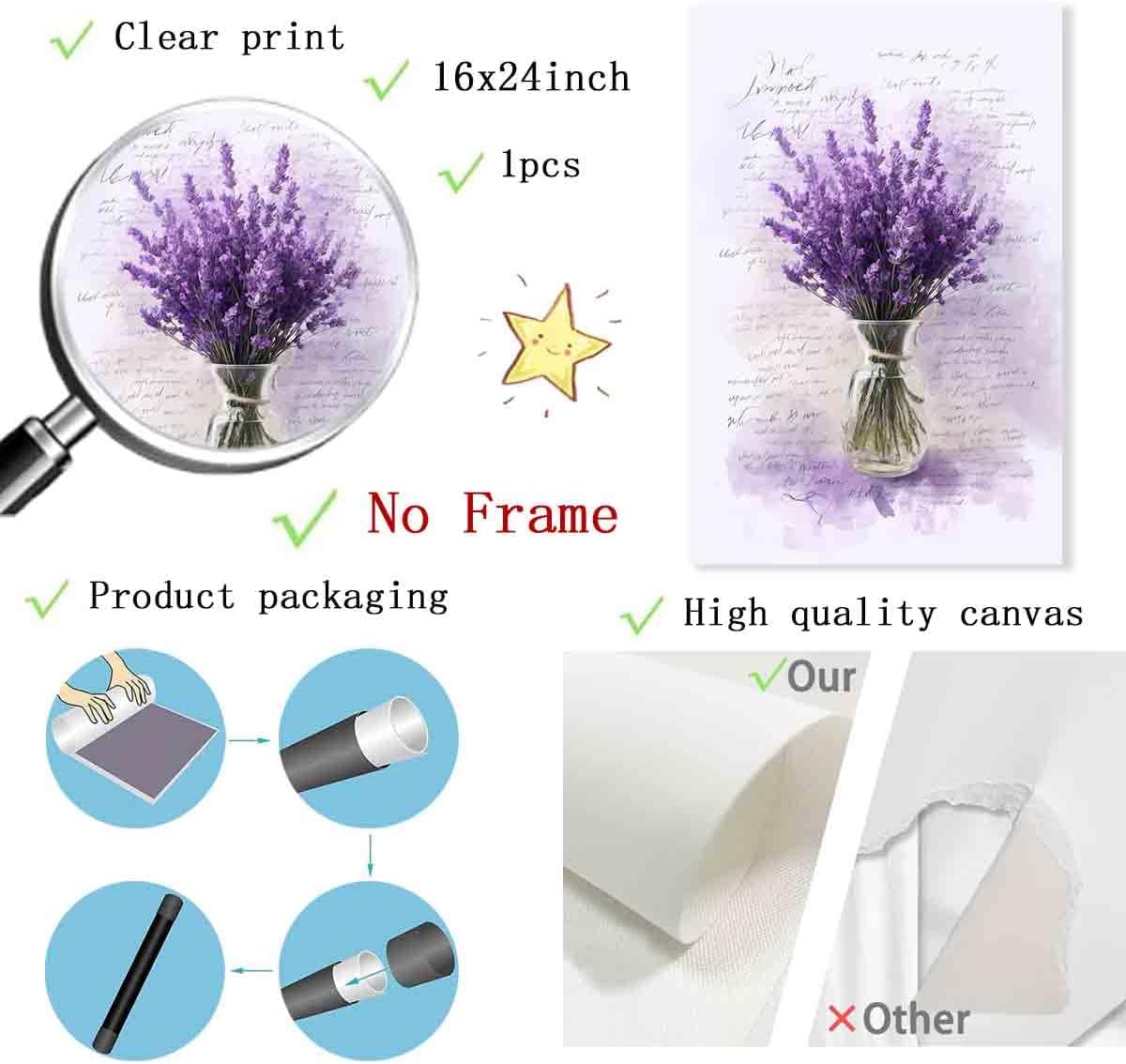 Lavender Wall Art Purple Flower Pictures Flowers In Vase Canvas Wall Art Country Floral Watercolor Flower Prints Rustic Floral Painting Plant Pictures Botanical Flower Prints Decor 16x24inch No Frame