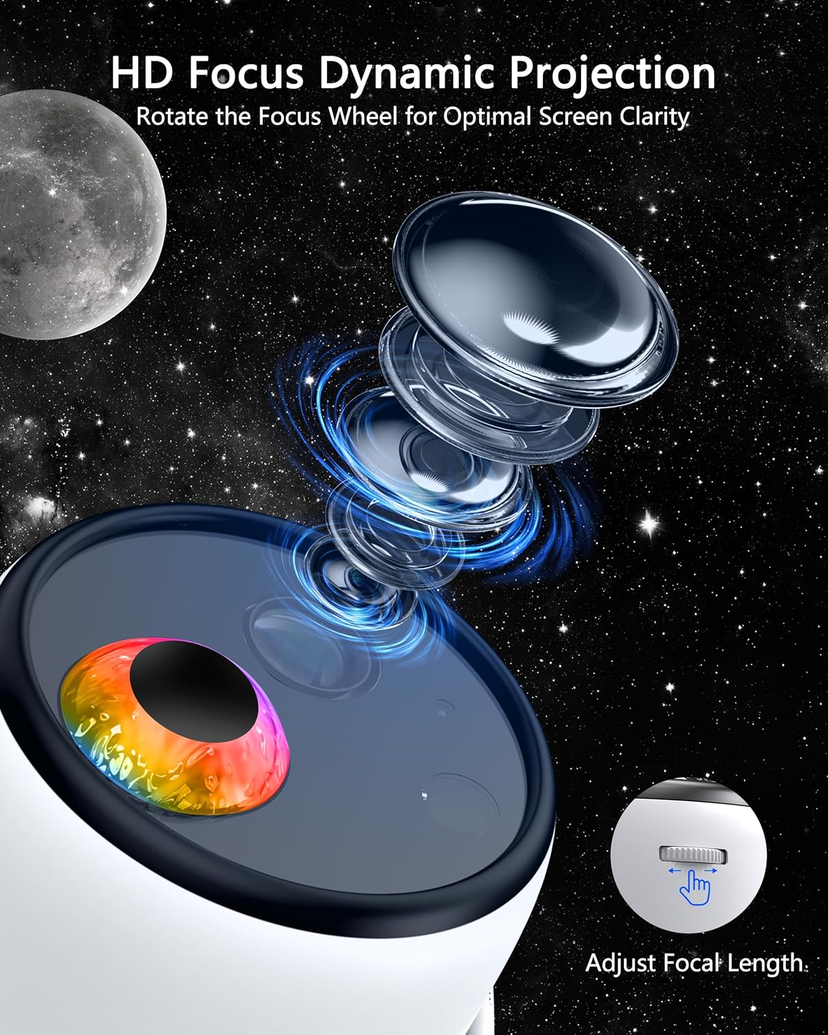 - Flexible Projection & Focus: Equipped with a high-definition lens, our galaxy night light projector delivers sharp images within 3â5 meters. Adjust the 180° angle and focus wheel to display dynamic scenes on ceilings, wallsâcreating a personal planetarium in seconds