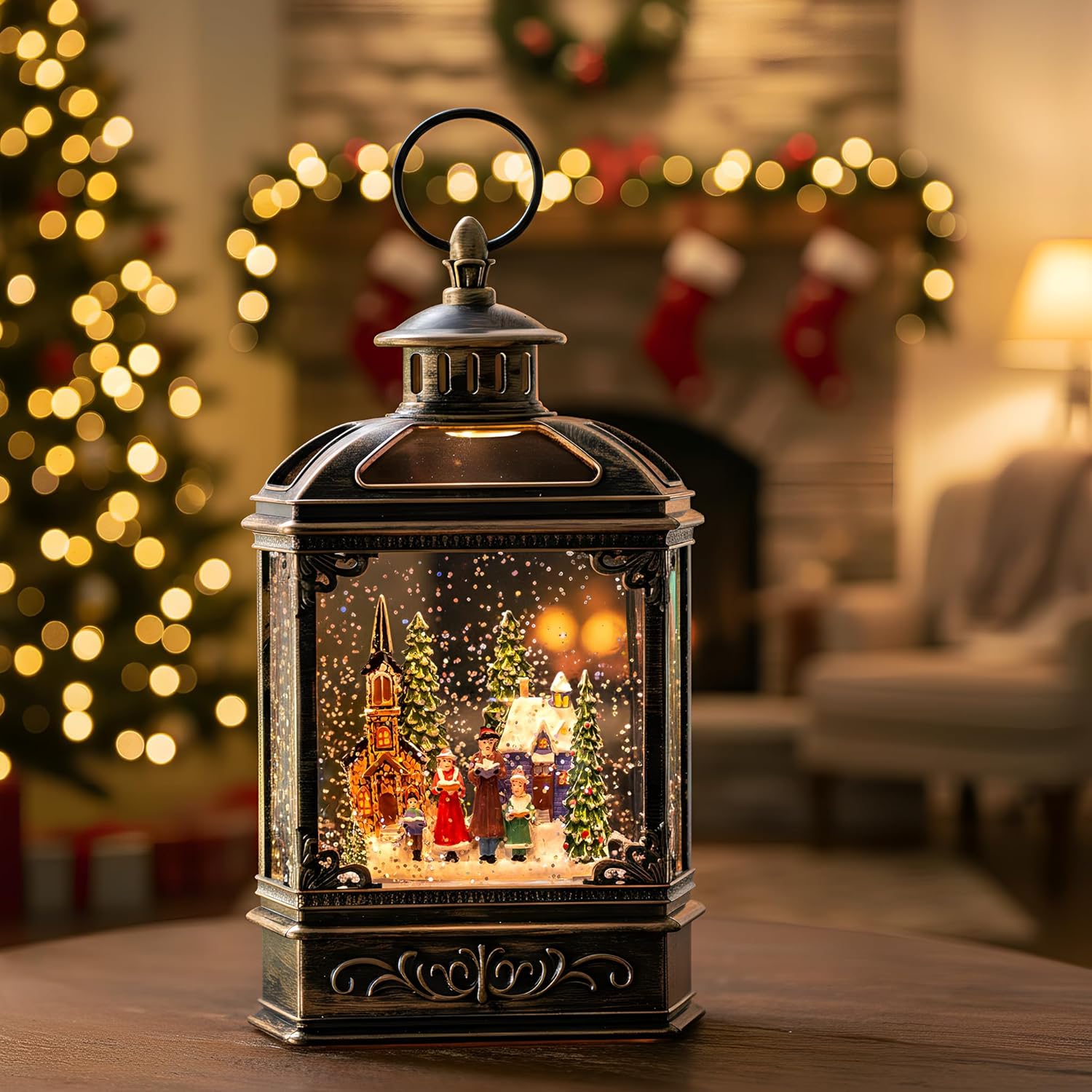 Christmas Snow Globe Lantern Water Glittering Town Home with Carolers, Music & Timer, USB Lined/Battery Operated Lighted Lantern for Christmas Festival Decoration Gifts