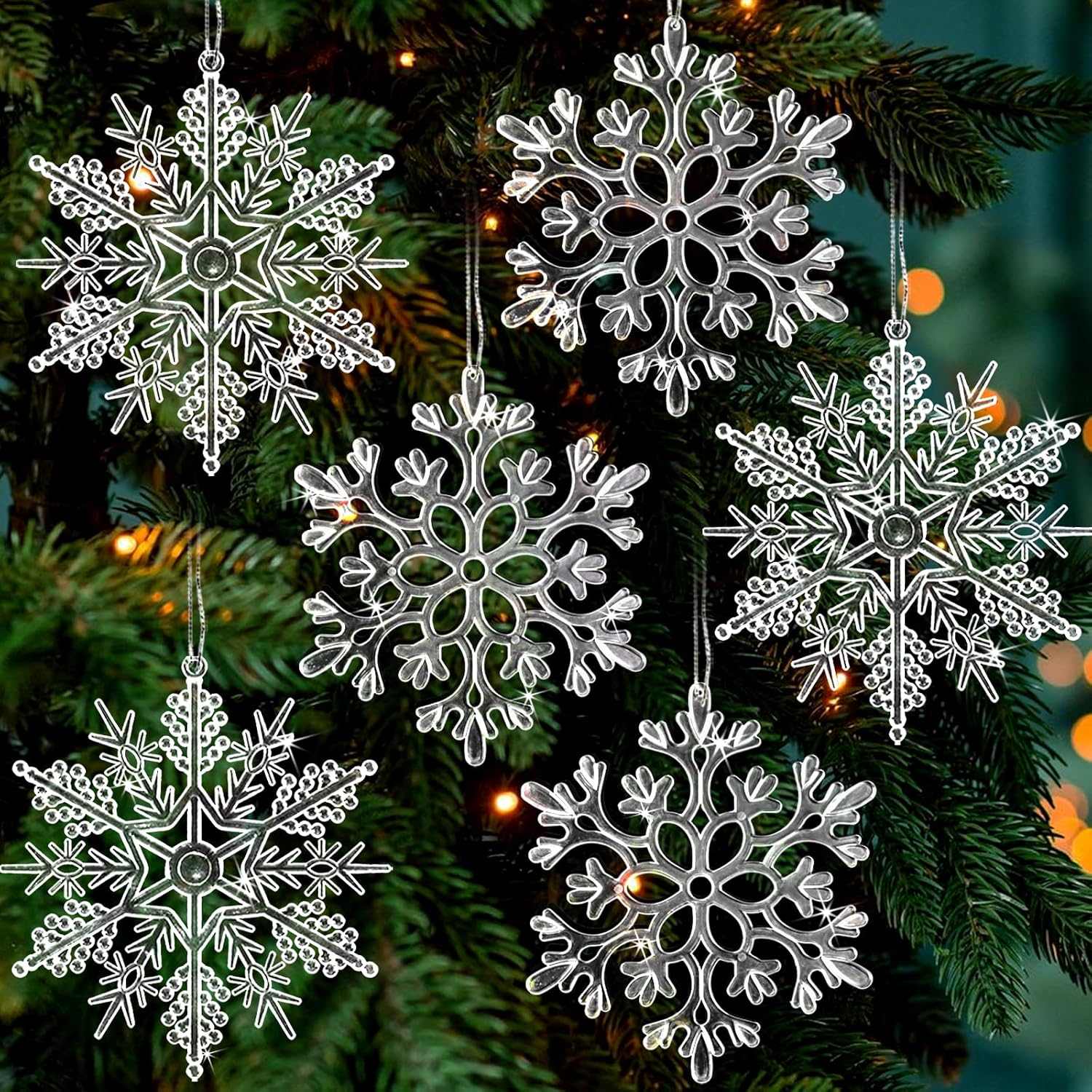 - What's in The Box: You will receive 6pcs big clear snowflakes, approximately 12 inches in height, featuring two different designs. Additionally, each Each glitter clear snowflakes decorations comes with a silver hanging string for easy display. These large size snowflakes ornaments are perfect for both indoor and outdoor winter Christmas decorations, adding a unique festive atmosphere to your holiday celebrations