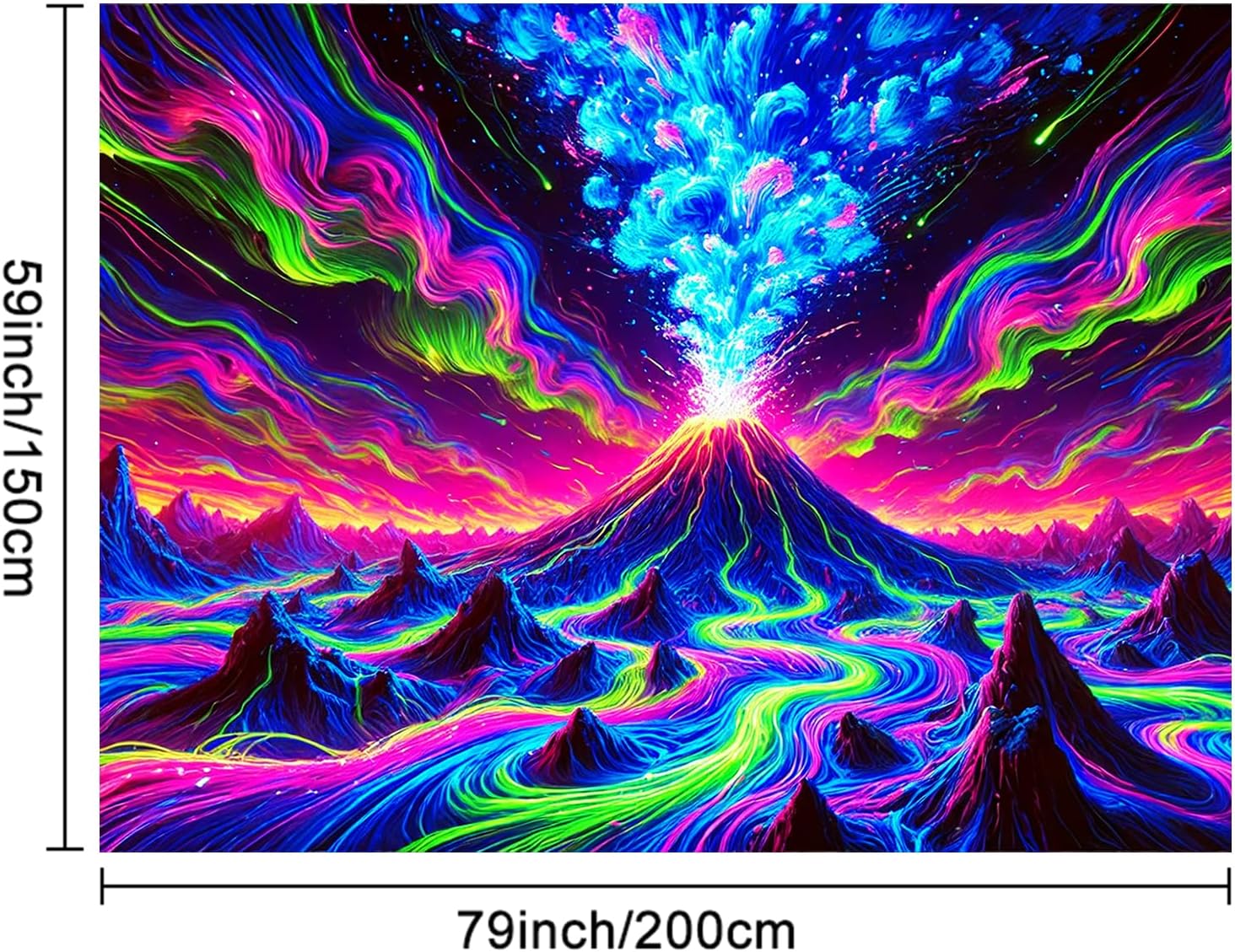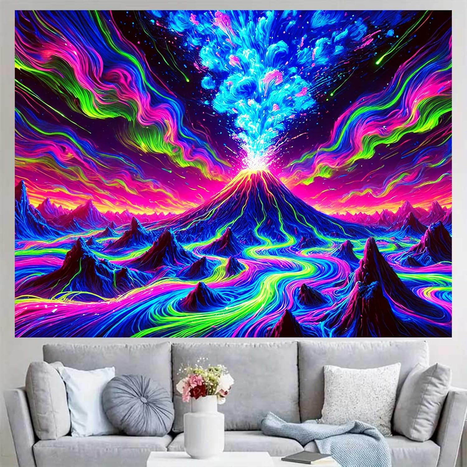 - Explosive Volcano Artwork: A vibrant volcano erupts into colorful streams and glowing clouds, making this UV tapestry a visual powerhouse for bold rooms.