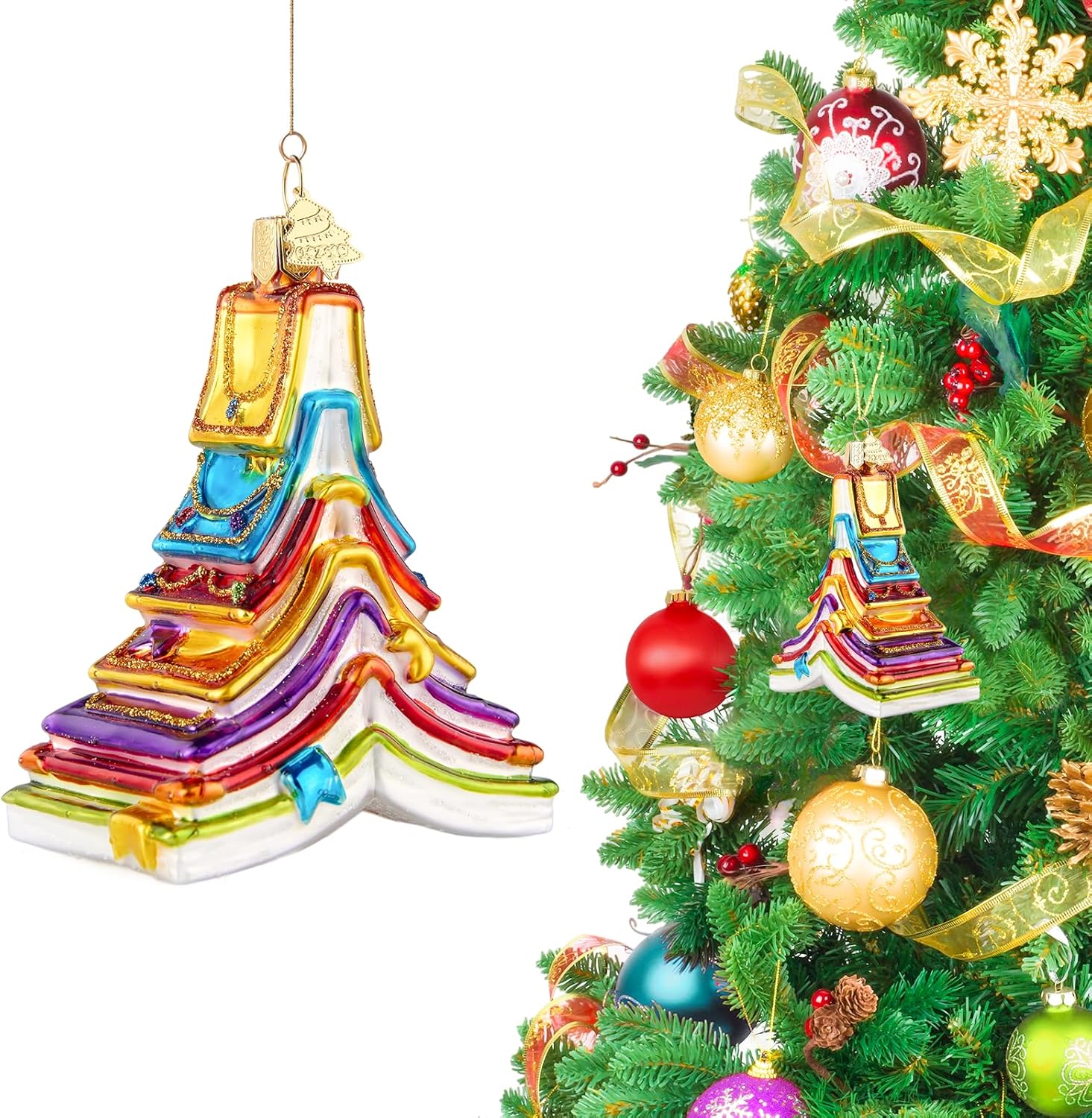 Book Christmas Tree Ornaments,Hand-Blown Glass Ornaments,Colorful Book Tree Shape Watcher Collection Figurines Hanging Ornament,Christmas Decorations for Reading Lovers Holiday Party Home Gift