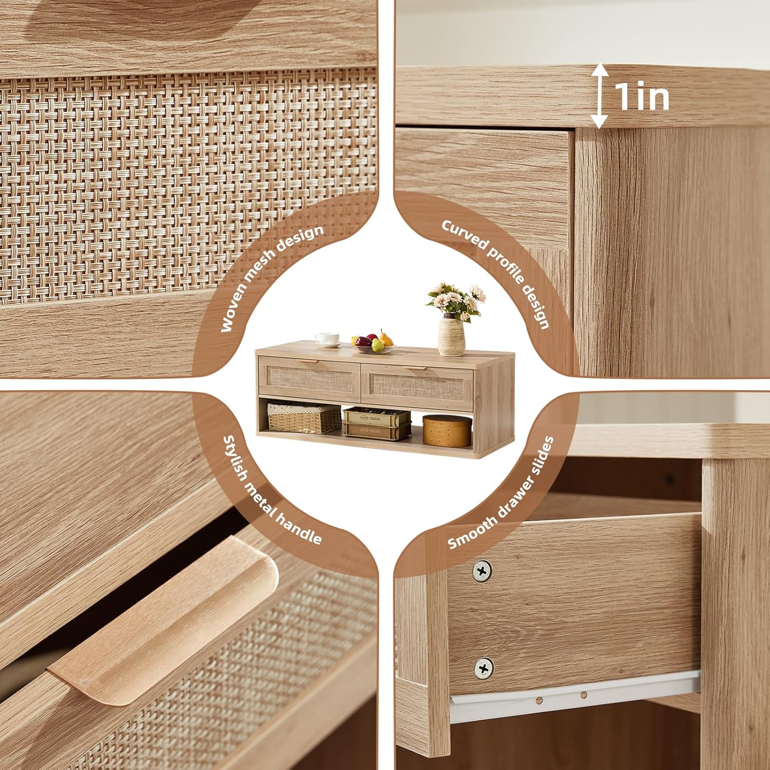 - Quality Metal & Wood Material:This wooden coffee table is equipped with two equally sized drawers that feature quality metal handles and smooth-gliding metal runners. Its structure combines a robust wood frame with a woven rattan design. The curved-edge design of the tabletop enhances safety, particularly for families with children.