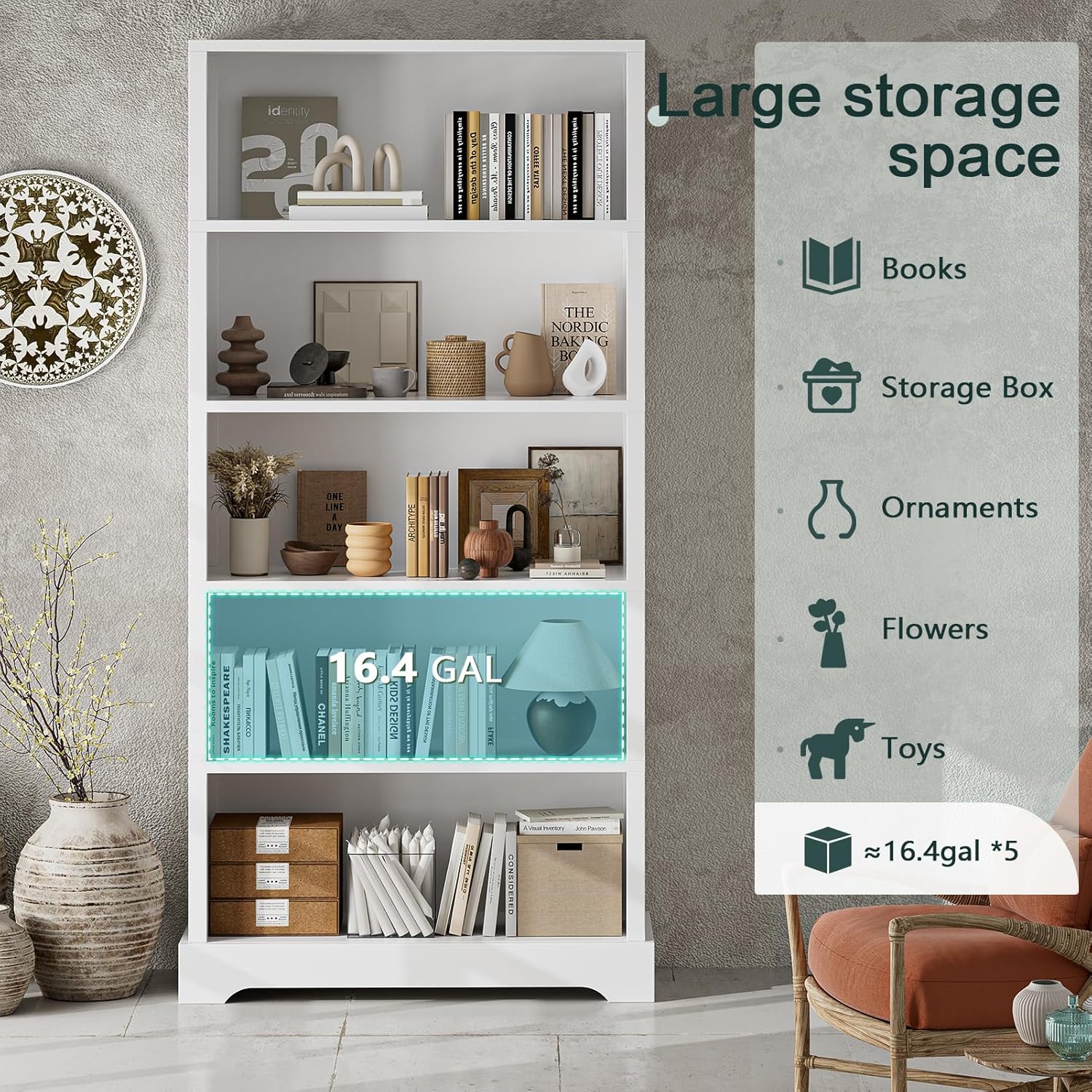 TVU 5-Shelf Wood Bookcase, 65 Inch Tall Bookshelf with Storage, Floor Standing Display Book Shelf,for Living Room Bedroom Study Office, White