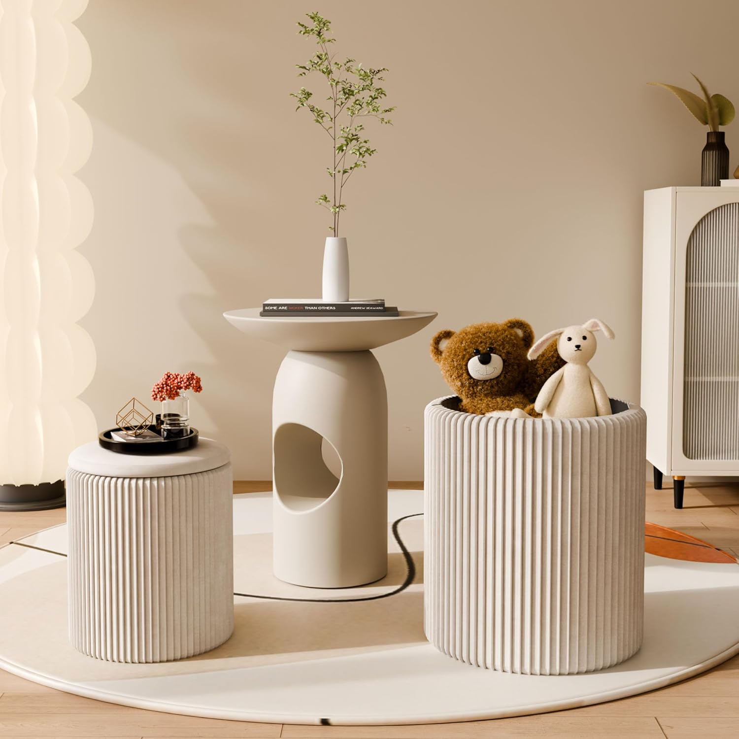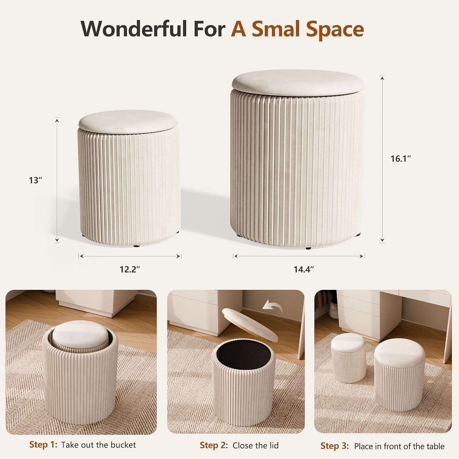 Ottoman with Storage Set of 2, Velvet Storage Ottoman, Upholstered Sponge Vanity Stool Support 300lbs, Multifunctional Coffee Table Foot Rest Ottomans for Living Room Bedroom, Beige
