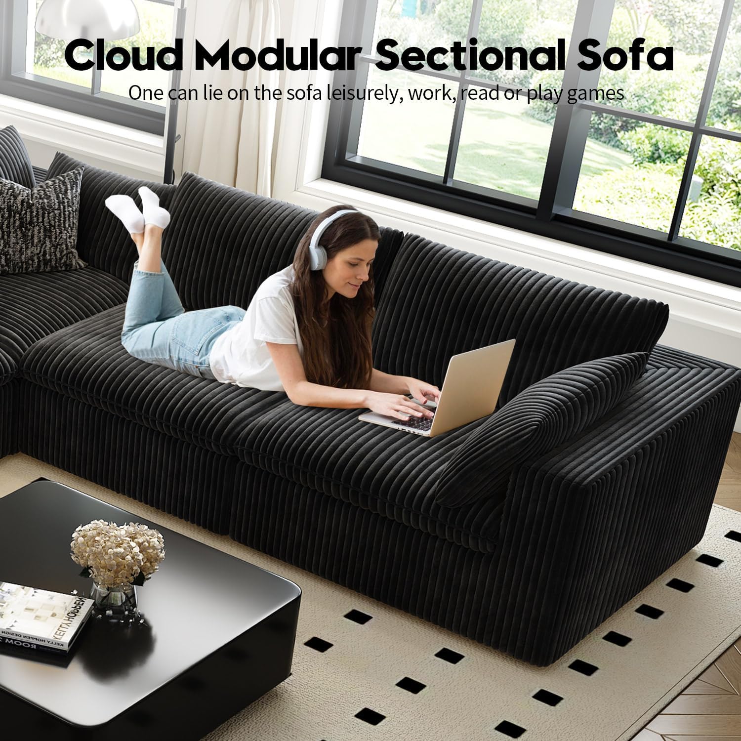 118" Cloud Couch Modular Sectional Sofa for Living Room,Modern Sofa with Deep Seat,L-Shape Boneless Couch with Ottoman,Comfy Upholstered Corduroy Couches for Apartment, Studio, Office,Bedroom,Black