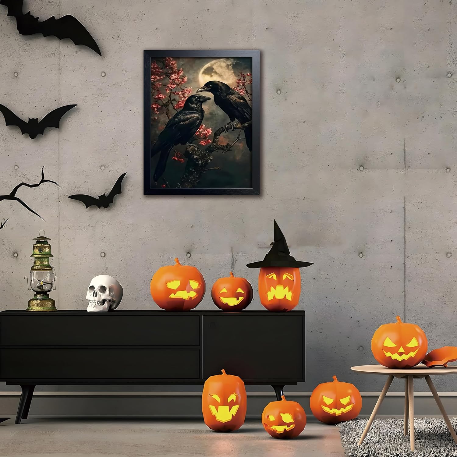 - Gothic Halloween Wall Art-This Black Wood Framed Halloween Canvas Wall Art features a vintage black crow resting among soft cherry blossoms, creating a striking contrast of dark mystery and delicate grace. A perfect piece for fans of gothic decor, dark academia, and nature-inspired art.
