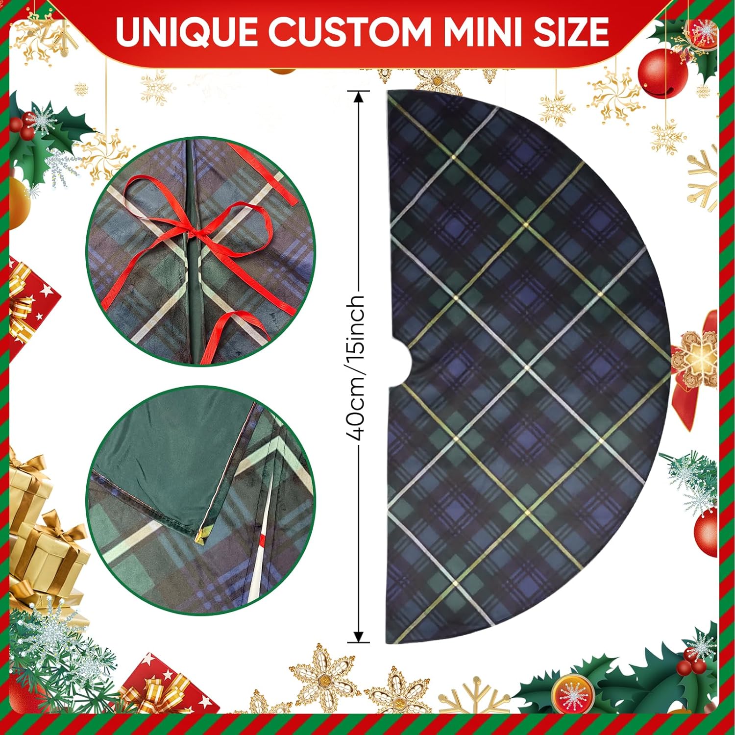- Mini & Versatile Décor – Great for desks, bookshelves, mantels, countertops, coffee tables, reception areas, or store displays. Whether for tiny Christmas trees, slim pencil trees, or compact artificial trees, this tartan tree cloth adds plaid elegance to small spaces.