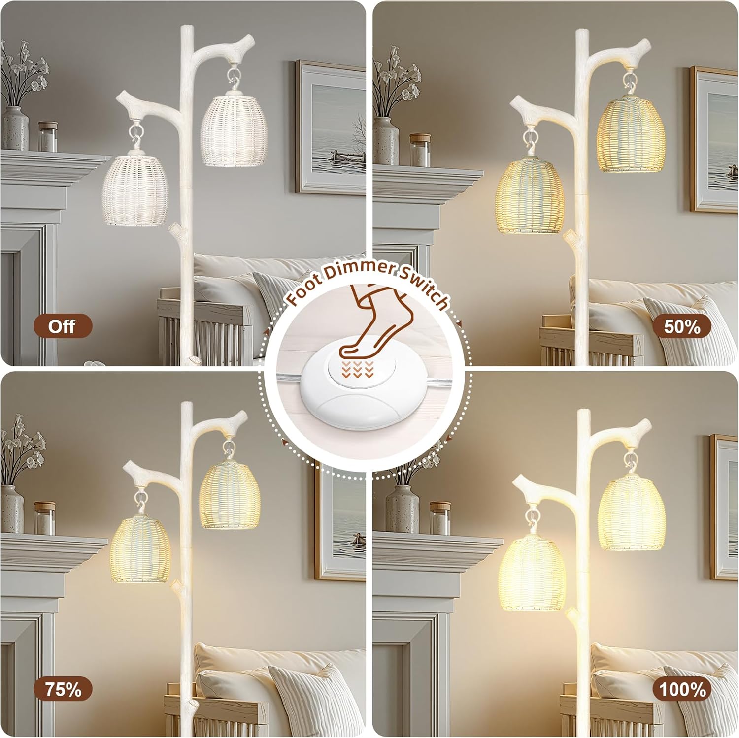- NATURAL RATTAN WOVEN SHADE, SOFT LIGHT, COZY ATMOSPHERE: Standing lamp, with 2 rattan woven lamp shade, washed white finish that color matching with lamp body, adequate light glows through it, eye-friendly, excellent lighting standing lamp gives you cozy vibes. 2pcs x 9W (E26 base) bulbs are included to brighten and classic for your home