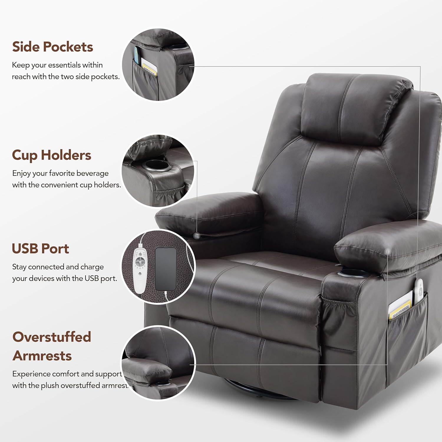 - [CONVENIENT DESIGN] The recliner chairs for adults is equipped with one USB port, which can charge your devices easily while you are sitting or reclining. It has a four-pocket design where you can place the remote control or magazines in the side pockets and your phone or other small objects in the front pockets. Additionally, each hand of the rocking recliner chair has one cup holder, allowing you to enjoy your favorite beverage within your reach. (Note: The USB port is ONLY for low-power devices.)
