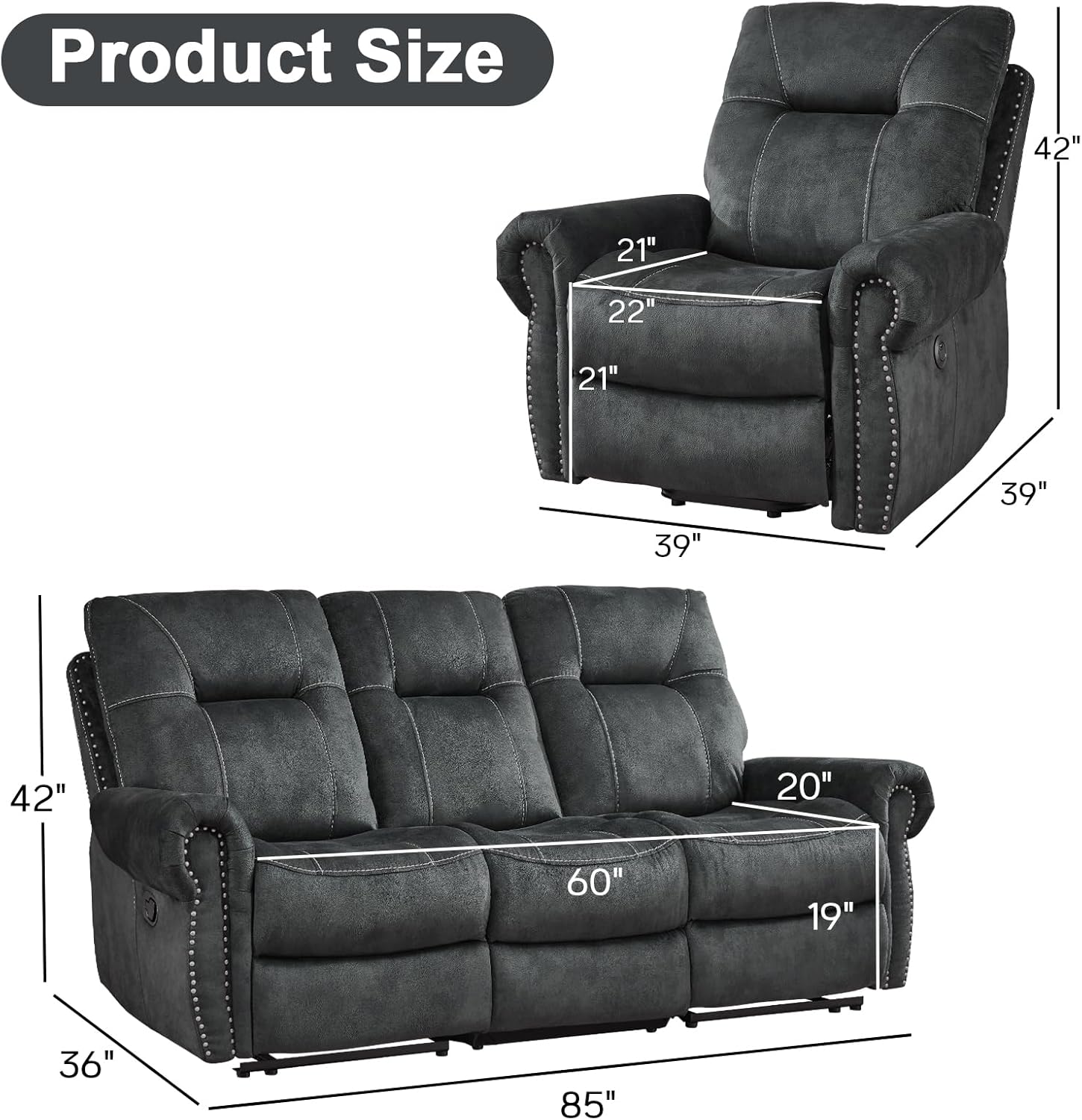 EBELLO 2 Pieces Reclining Couch Furniture Set for Living Room, 1 Seat Power Recliner and a 3 Seater Sofa, Vintage Rivet Mid-Century Design for Living Room, Grey