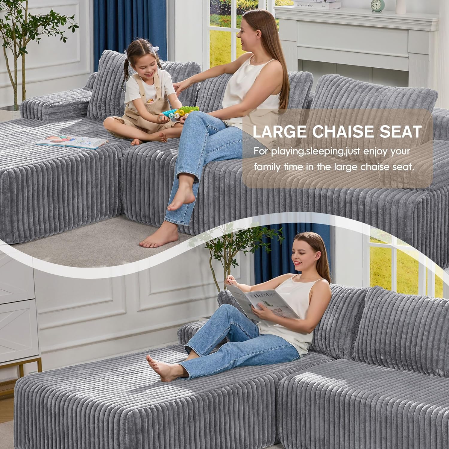- Versatile and Flexible Modular Sofa: Our sectional sofa couch consists of 2 L-shaped oversized chaises, each L- shape sofa is lightweight. This modular sectional couch have 4 using modes, you can convert the modular sectional sofa according to your needs. Add flexibility and personalized style to your living space.