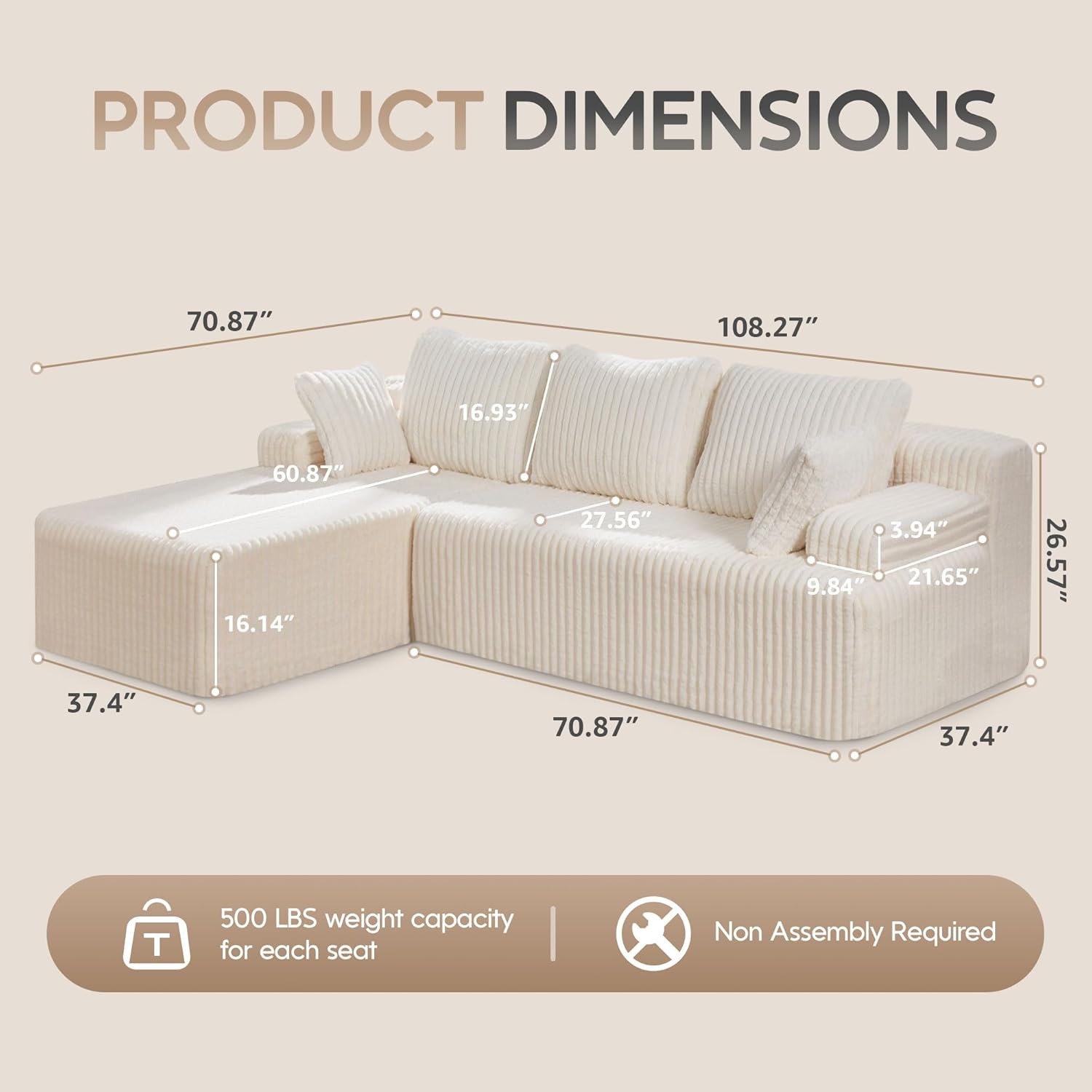 - No Assemble Required: Easy to assemble even if you are alone! Unpack the vacuum package, pat the L shape couch, and let it absorb air for about 2 to 3 days to restore it to its original status.