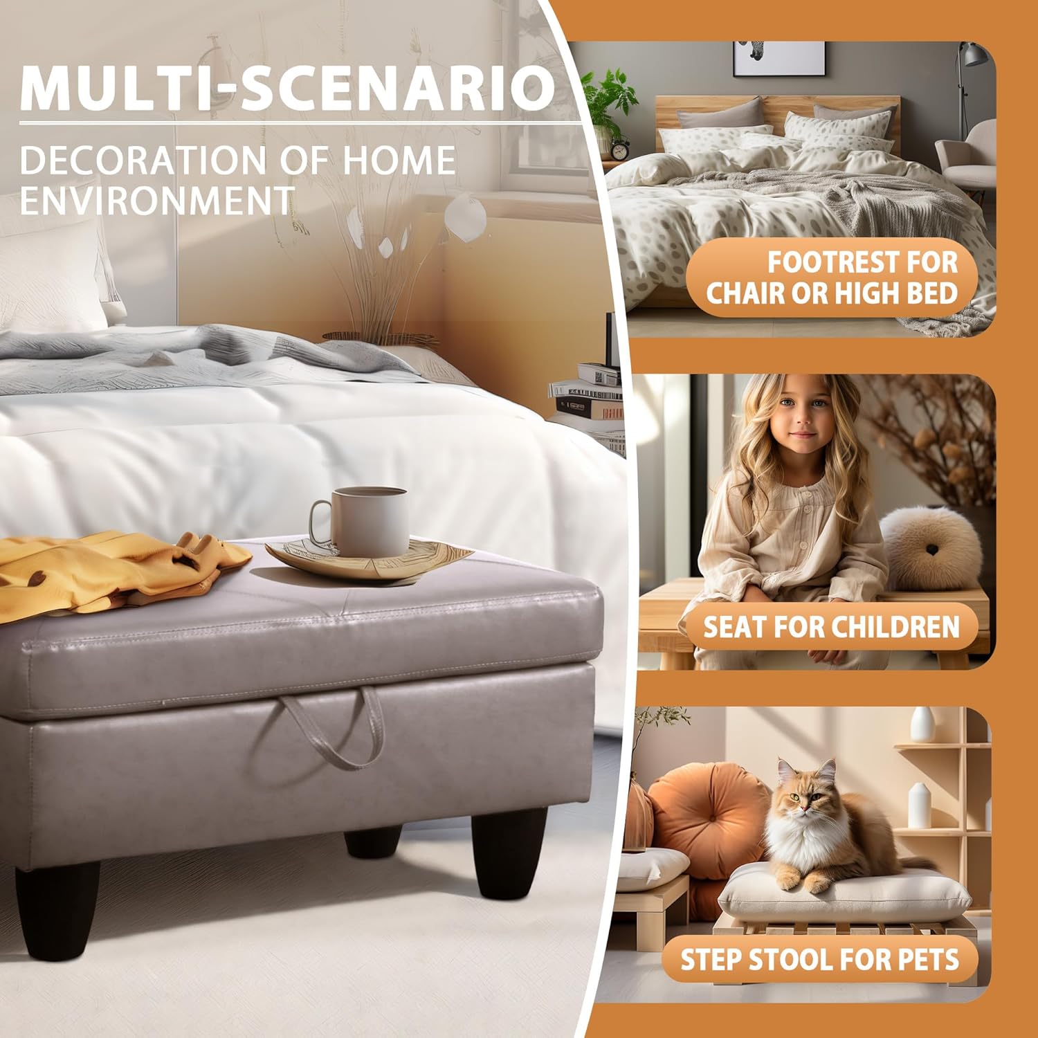 - OTTOMAN BENCH: This versatile storage ottoman doubles as a comfortable bench, perfect for entryways, living rooms, or bedrooms. Designed to blend style with functionality, it provides both extra seating and hidden storage, making it a practical and stylish solution for any space.