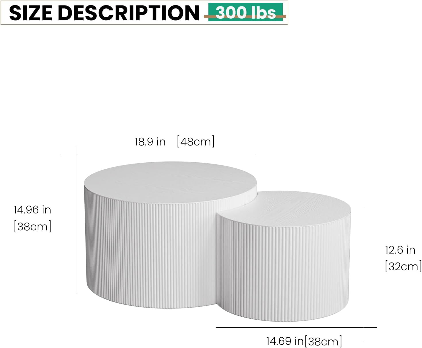 Round Nesting Coffee Table Set of 2 Handcraft Circle Fluted Nesting Coffee Tables Circular Side Table Drum Accent End Tables for Living Room Bedroom (White B Small)
