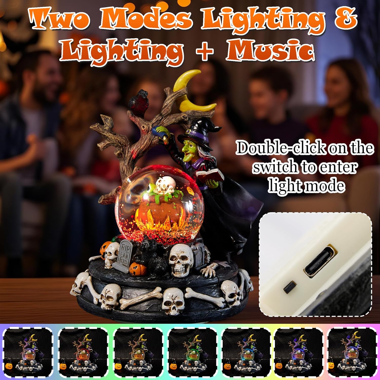 - 🎶🎃【 Musical and Light 】Our Halloween decorative snow globe come in two modes: "lighting + music" or "lighting". Turn on the switch, and the musical snow globe will scary sounds lighted halloween atmosphere. Great for spooking your friends or scaring the people you send gifts to. Double-click the switch and you can enjoy the crystal ball under the gradient colored lights.