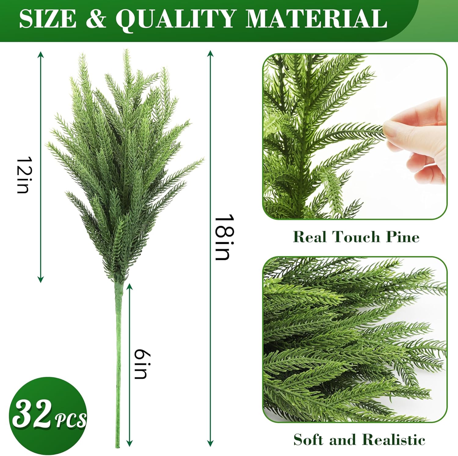 - Quantity and Size: With 16pcs Norfolk pine stems included in each bulk purchase, you have sufficient artificial pine branches to create stunning arrangements throughout your home. Each Norfolk Pine Branch is about 18 Inches and made of soft plastic which make these Norfolk pine stems hung down naturally. It is perfect Christmas greenery for vase filler and Christmas centerpieces for tables.