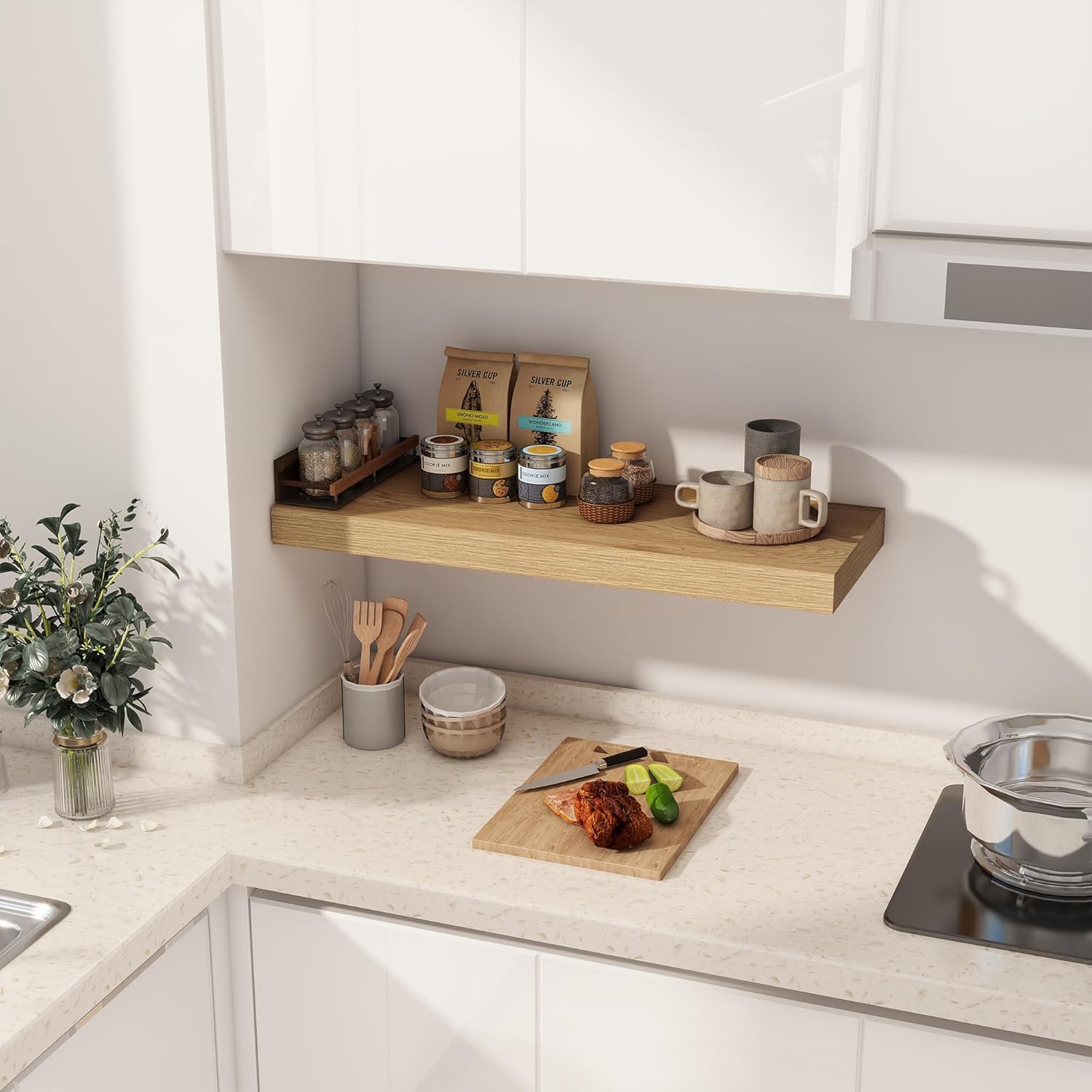 - ăFARMHOUSE RUSTIC WALL SHELFăThese floating shelves are made of premium engineered wood board and invisible one-piece bracket. The rustic wooden grain surface add character and warmth to any modern or traditional interior with these thick floating shelves, contrast shelves at staggering heights on the wall or mount side-by-side or in the corner for a clean streamlined look.