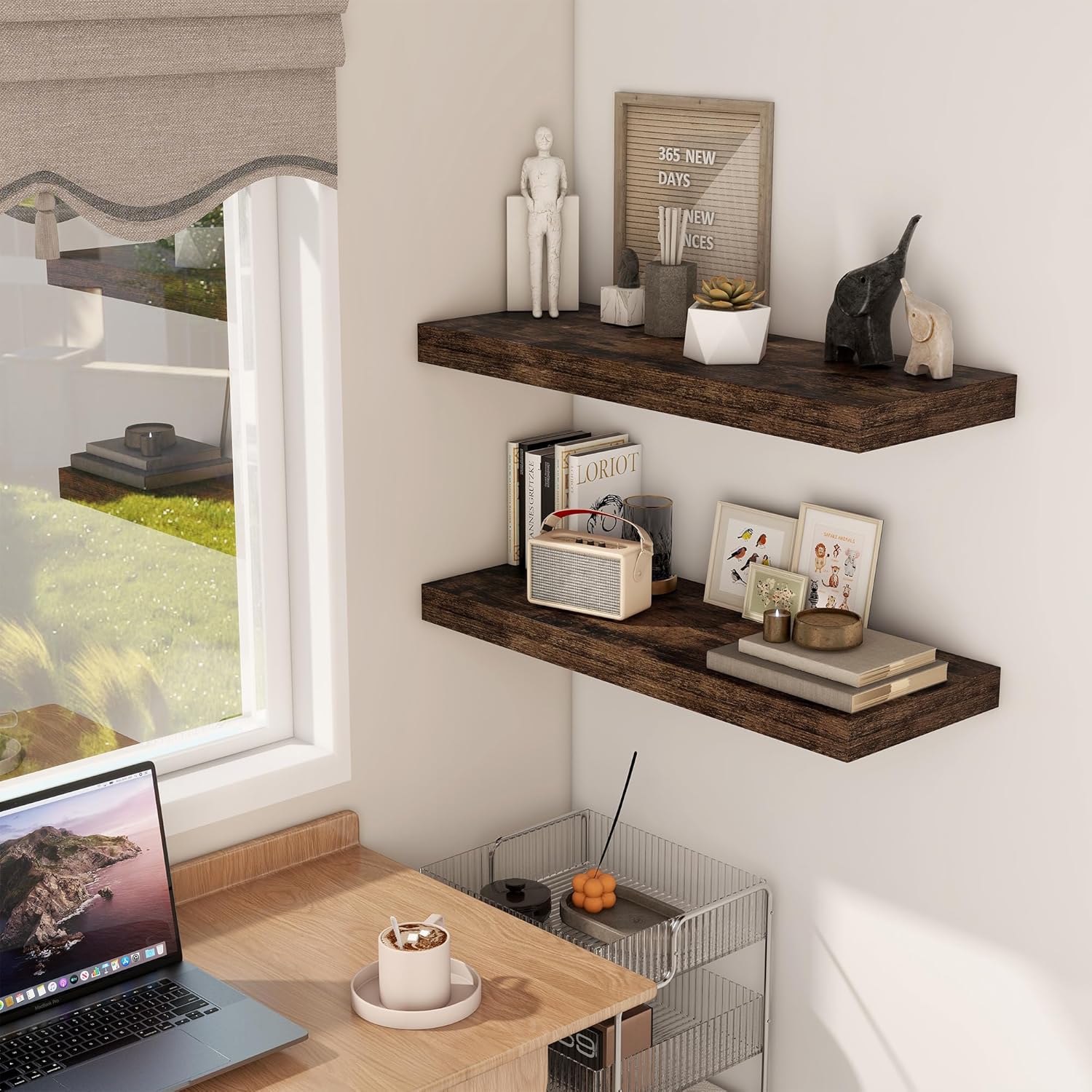 - ăFARMHOUSE RUSTIC WALL SHELFăThese floating shelves are made of premium engineered wood board and invisible one-piece bracket. The rustic wooden grain surface add character and warmth to any modern or traditional interior with these thick floating shelves, contrast shelves at staggering heights on the wall or mount side-by-side or in the corner for a clean streamlined look.