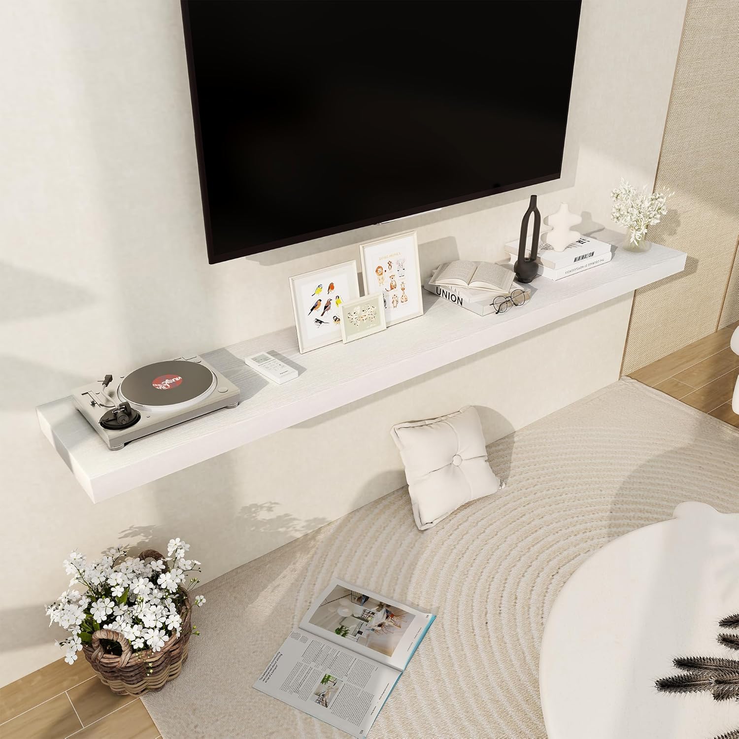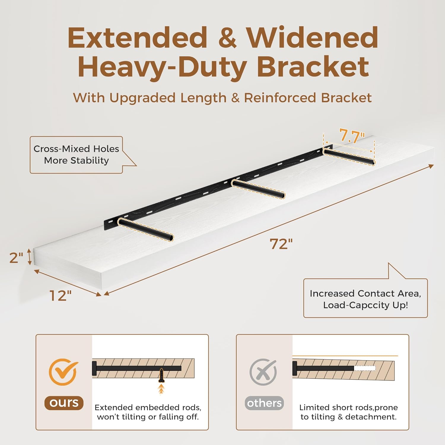 Fun Memories 72 Inch Floating Shelf, 12 Inch Deep Wall Shelf for Fireplace Mantel, Deep Storage Shelves for Home & Office, Wall Shelves with Invisible Bracket, White, Set of 1