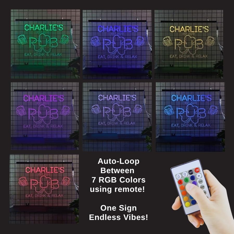 - Wide range of customizable bar signs for every space and mood. Choose from 1 or 2 color personalized neon bar signs, perfect for any custom pub sign or personalized beer sign. Available in 6 LED colors—blue, green, yellow, red, pink, and white. Each sign supports up to 2 colors, letting you personalize your home bar with the perfect mix.