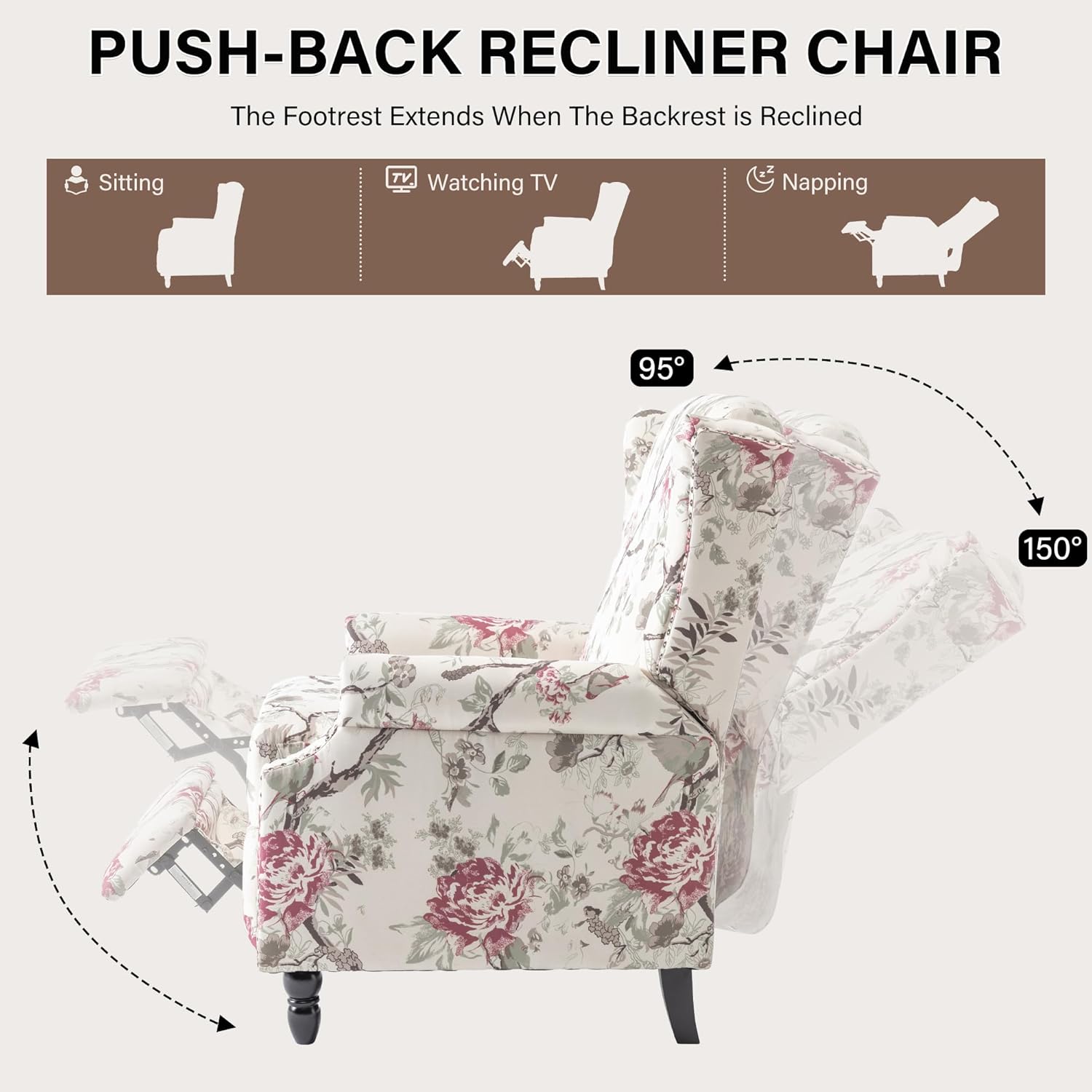 UIXE Pushback Recliner Chair, Fabric Upholstered Armchair Push Back Accent Chair for Living Room, Rivet Trim Home Theater Single Sofa Bedroom Reading Seat with Footrest - Beige Floral