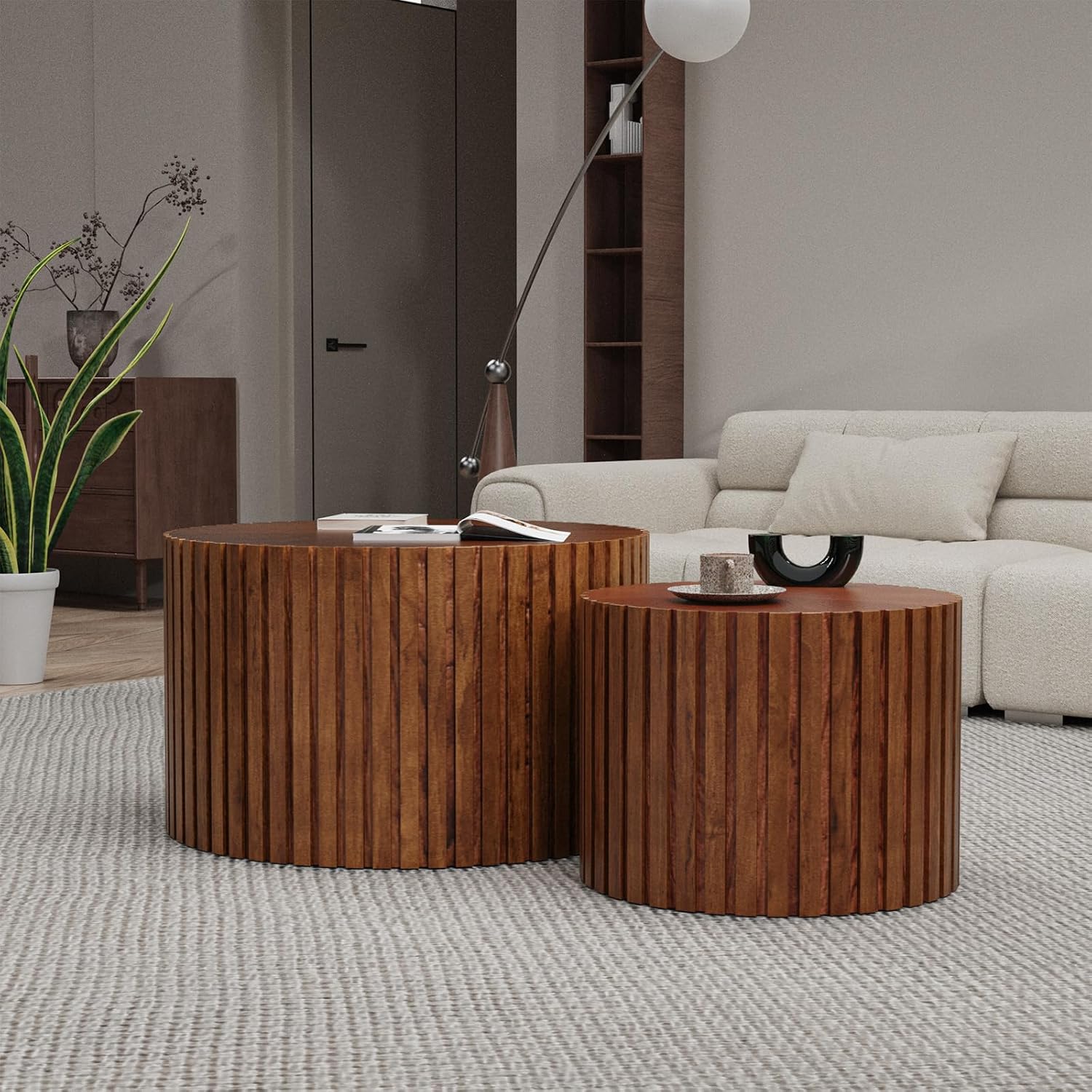 Round Coffee Table Set of 2, Nesting Coffee Table and End Table Set Small Circle Drum Side Table for Living Room Office, No Assembly (C Walnut Large)