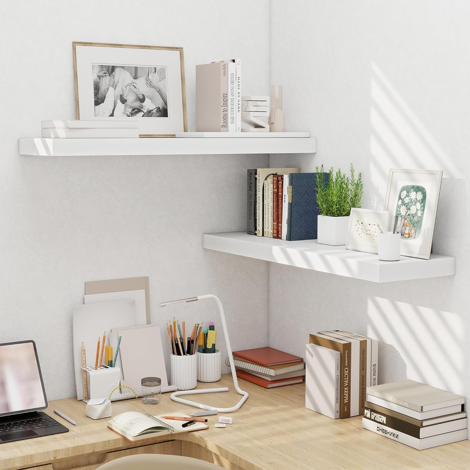 Floating Shelves Set of 2, 36 Inch Long Wooden Wall Shelves, 10 Inch Deep Wall Mounted Storage Shelf with Metal Brackets for Living Room, Bathroom, Bedroom and Kitchen, White