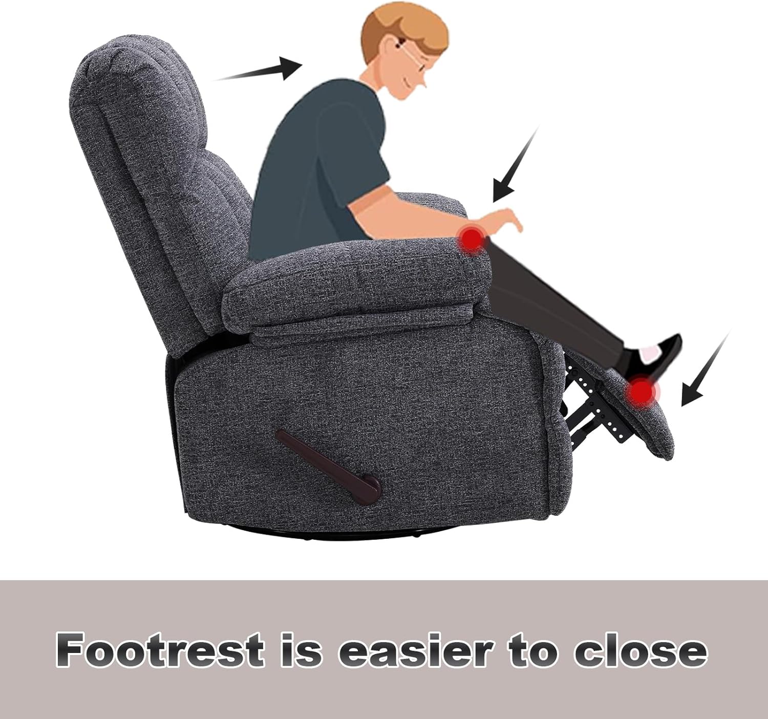 - 【EASY TO USE EXTENDED HANDLE 】:Tilting becomes exceptionally smooth with our extended high quality handle. The ergonomic design of our living room recliner ensures an easy grip, simply pull the handle to open the foot rest, then you can recline and stretch your body to choose from three comfortable positions: sitting, reading, or fully reclined (up to 150 degrees). When you're done, a slight forward lean in conjunction with your weight ensures the chair locks firmly into place.
