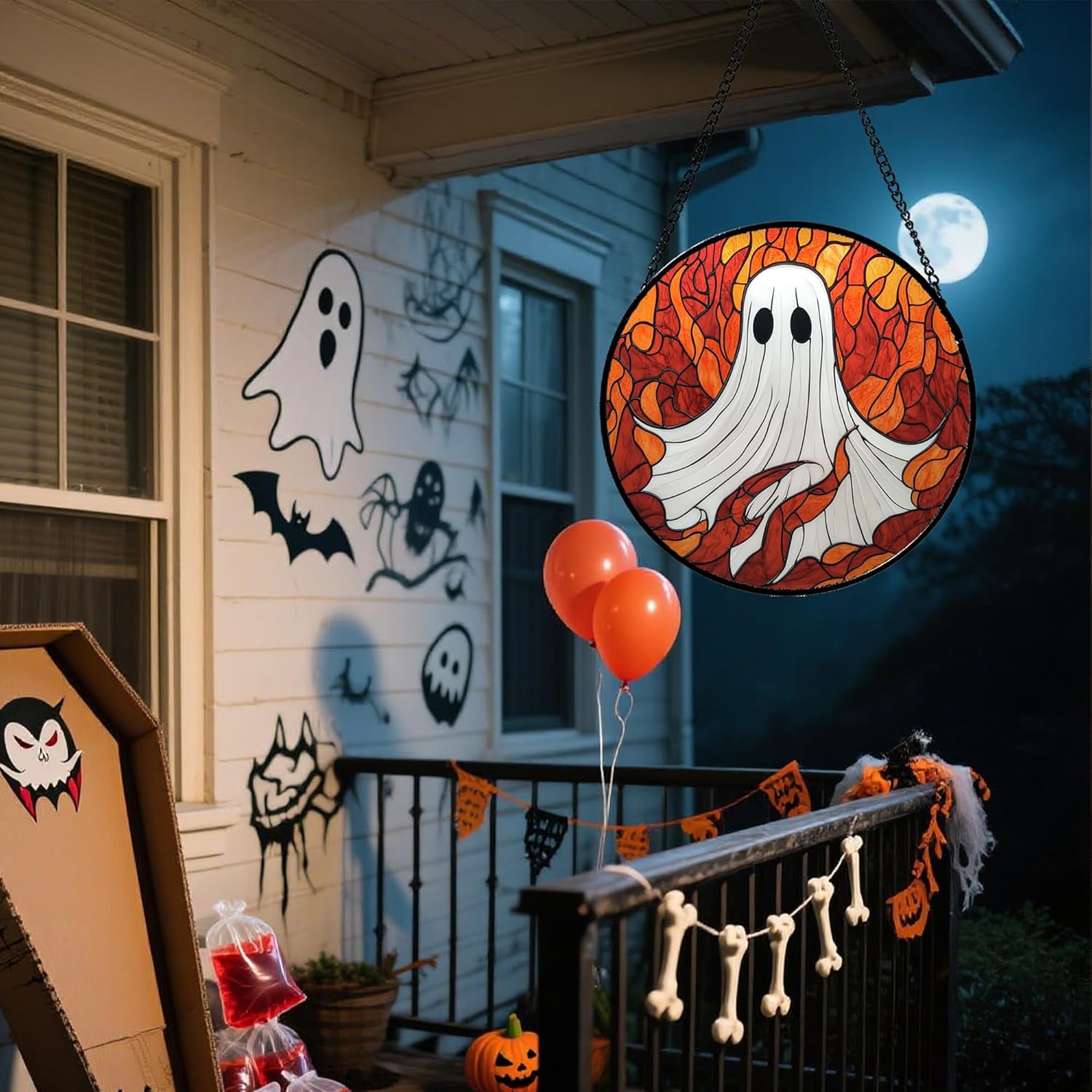 Stained Glass Window Hanging - Halloween Decorations White Ghost Orange Sky Suncatcher for Doors Garden Funny Spooky Sun Catchers Gothic Decor Horror Gifts for Women Men Friend Boy 11.8 in