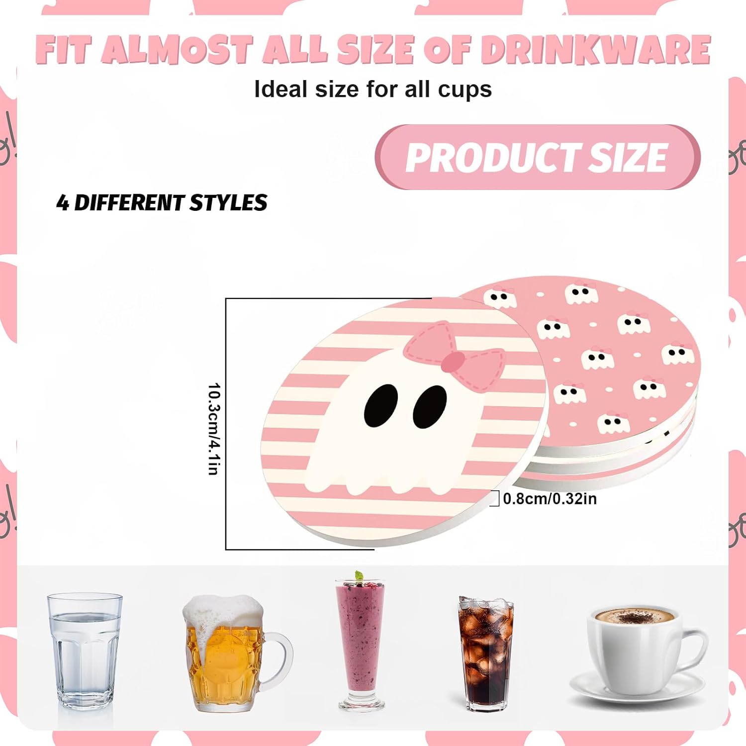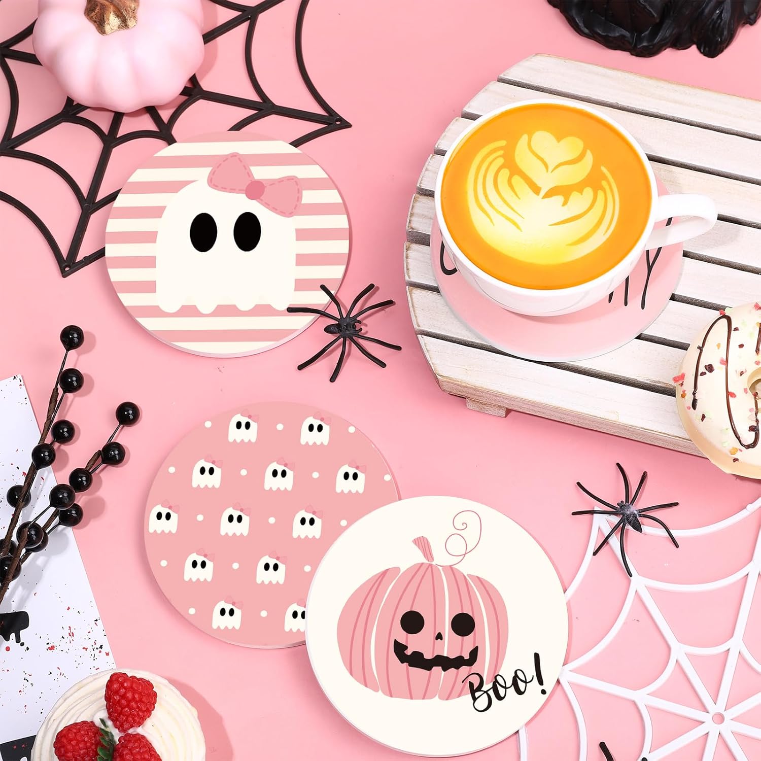 Whaline 4Pcs Halloween Ceramic Coasters Pink Ghost Pumpkin Drink Coasters Absorbent Cup Mat for Mug Cup Home Kitchen Party Table Decor