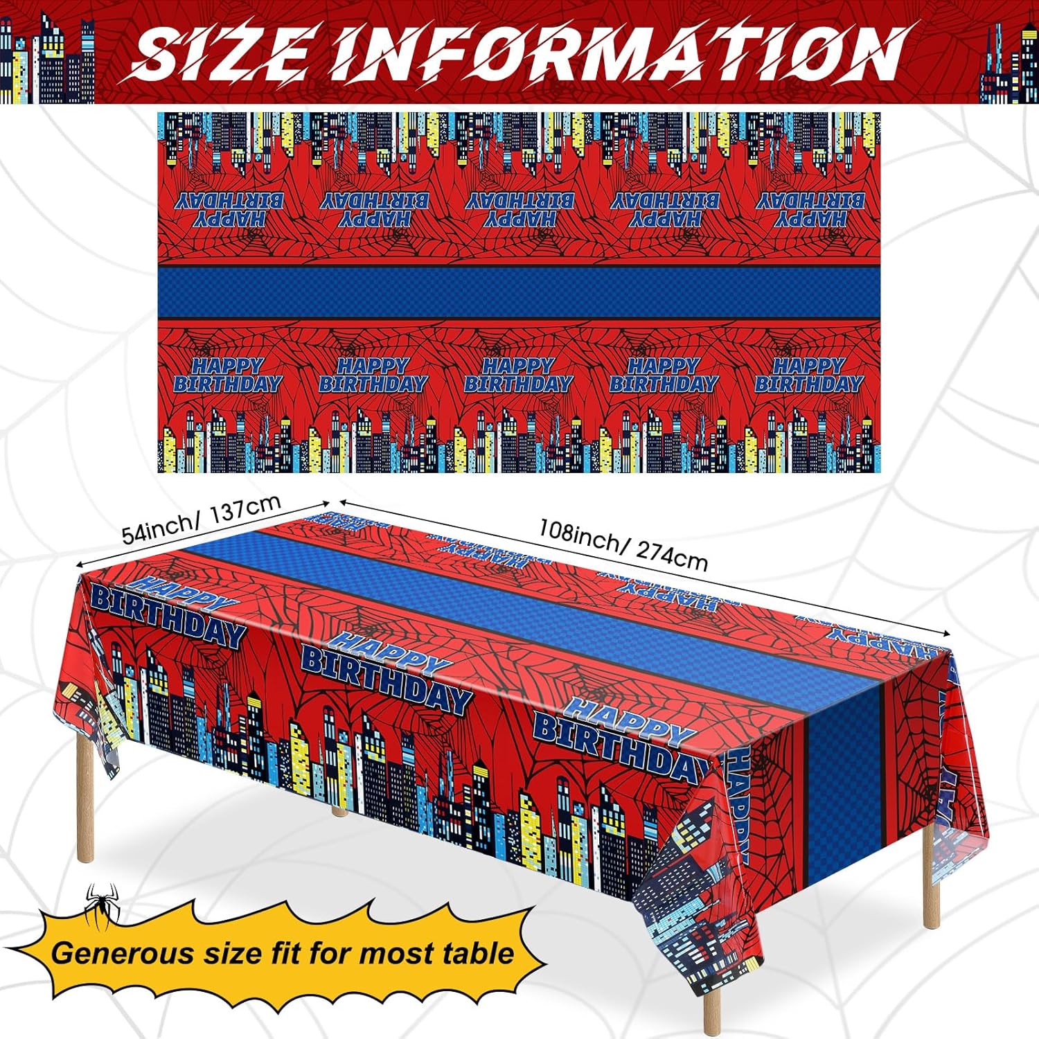 - Large Size: Each spider tablecloth measures 274 x 137 cm / 108 x 54 inches, large enough to cover most standard rectangular tables. Protects surfaces from spills and crumbs while setting the birthday party scene