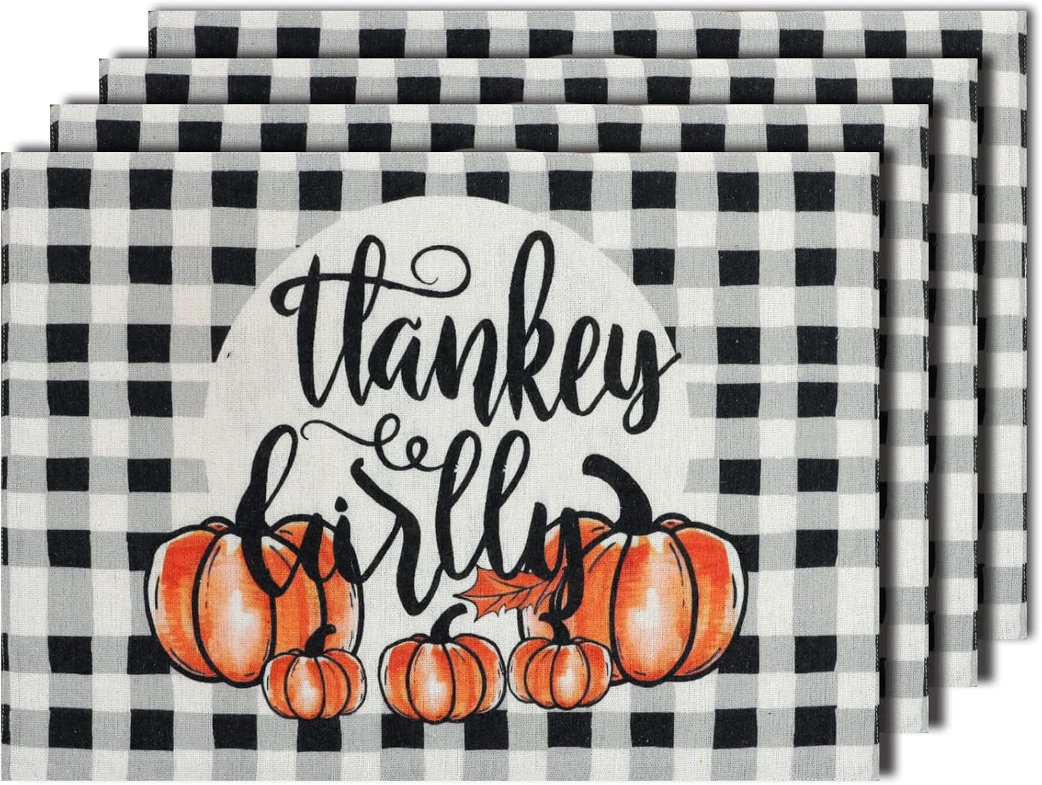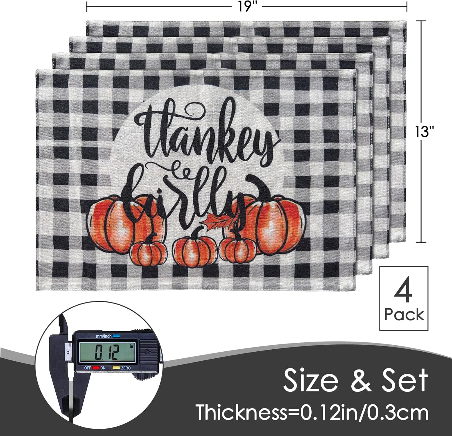 - Perfect Size & Versatility: You will get black and white placemats set of 4 for fall themed, with checkered and pumpkin pattern, 13x19 inches which enough for dinner plates and utensils, ideal for indoor or outdoor dining, from casual meals to festive gatherings