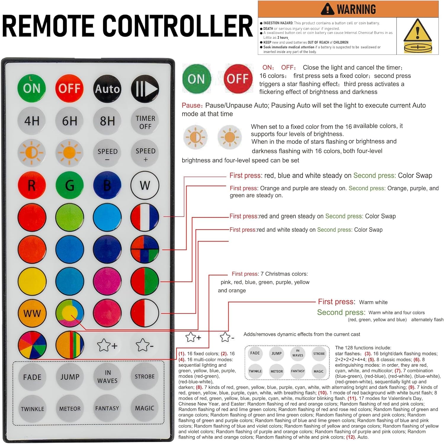 - Dual Control Modes: 1. Bluetooth App: Utilize the Bluetooth app for enhanced features like group control, DIY customization, scene settings, music synchronization, microphone mode, timers, display collections, and looping playback. 2. 44-Key Remote: Easily adjust brightness, speed, set timers, and switch lighting modes with the 44-Key remote. Multiple light strings can be grouped for integrated control, but they cannot be connected end to end