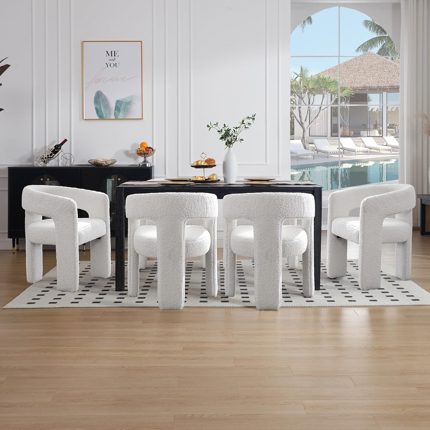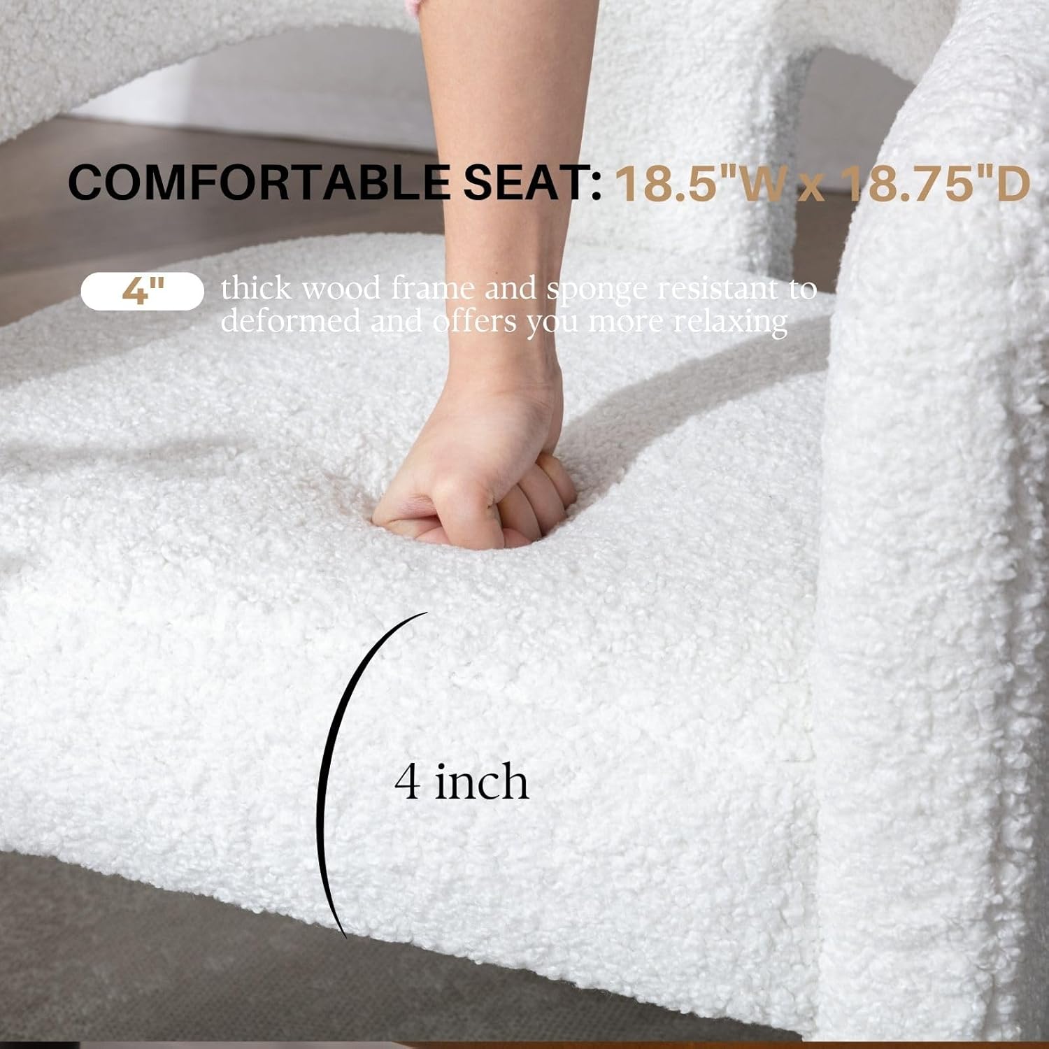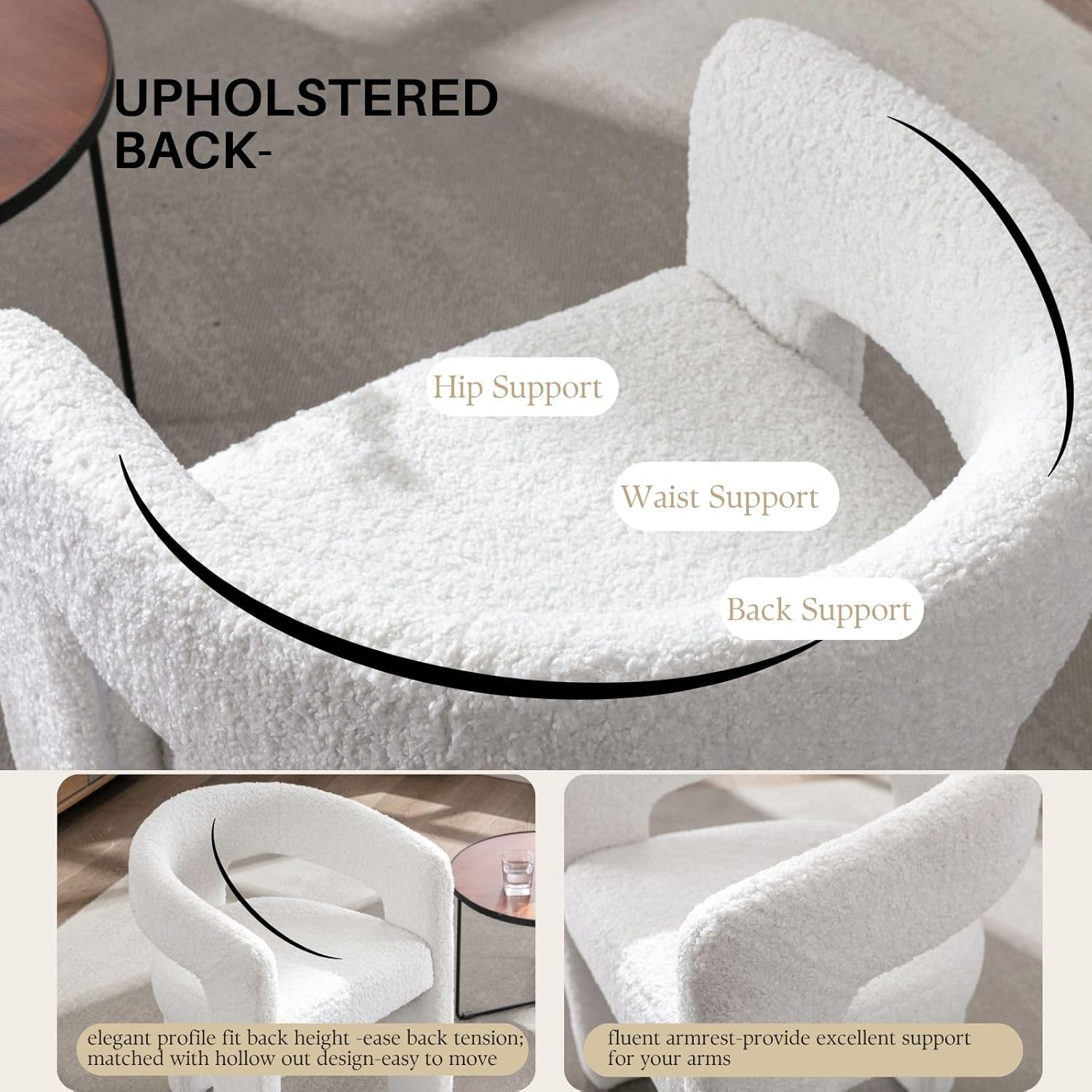 White Boucle Dining Chairs Set of 6, Modern Barrel Dining Room Chairs Upholstered Faux Fur Accent Chair with Arms and Round Back for Living Room Kitchen Armchair No Assembly Needed
