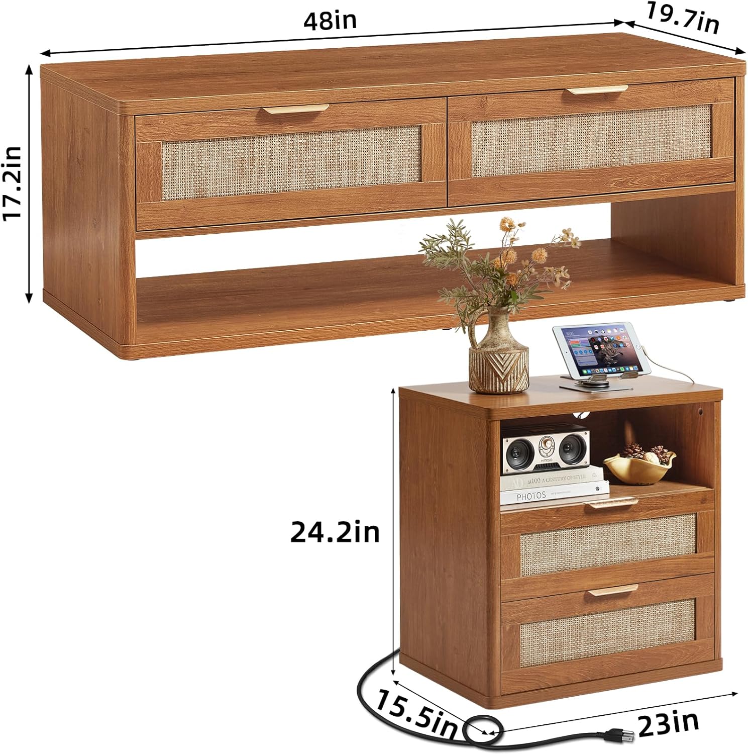 LEYAOYAO Boho Rattan Coffee Table and End Table Sets, 48" Wide Center Tables & 23" Night Stand with Charging Station Chest of Drawers, Brown Wood Coffee Table for Living Room 3 Piece Set