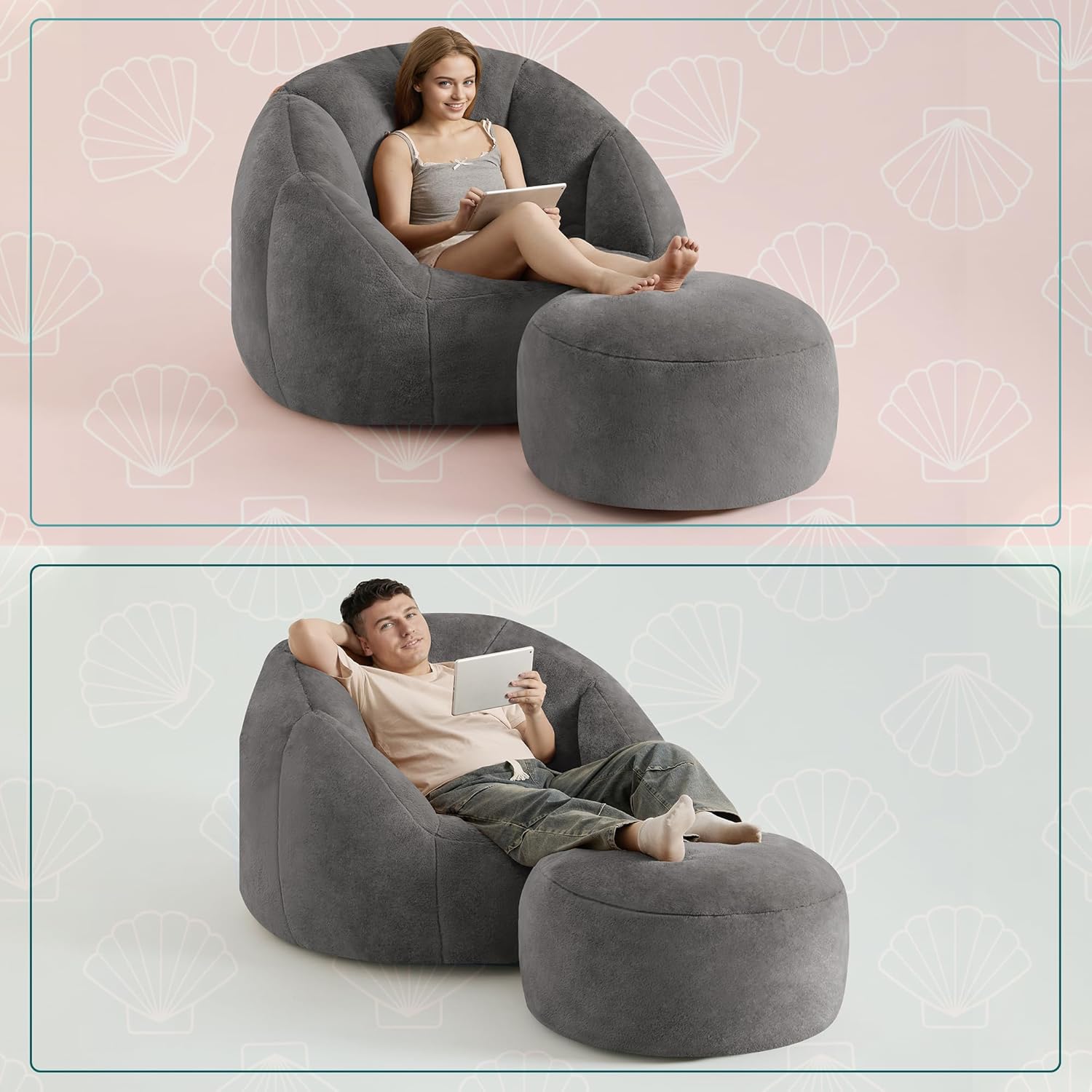 - Stylish, Durable, & Easy to Live With Who says comfy canât be cute? The giant bean bag reading chair comes in 3 classic colors: warm beige, neutral gray, and bright orangeâso it fits any roomâs vibe, whether your style is modern, cozy, or bold. The soft microsuede fabric feels amazing, itâs tough enough to handle daily life (no stress if your kid spills juice or your dog hops on itâjust wipe it clean with a damp cloth!). With thick fabric that resists tears and fades, even after years of use.
