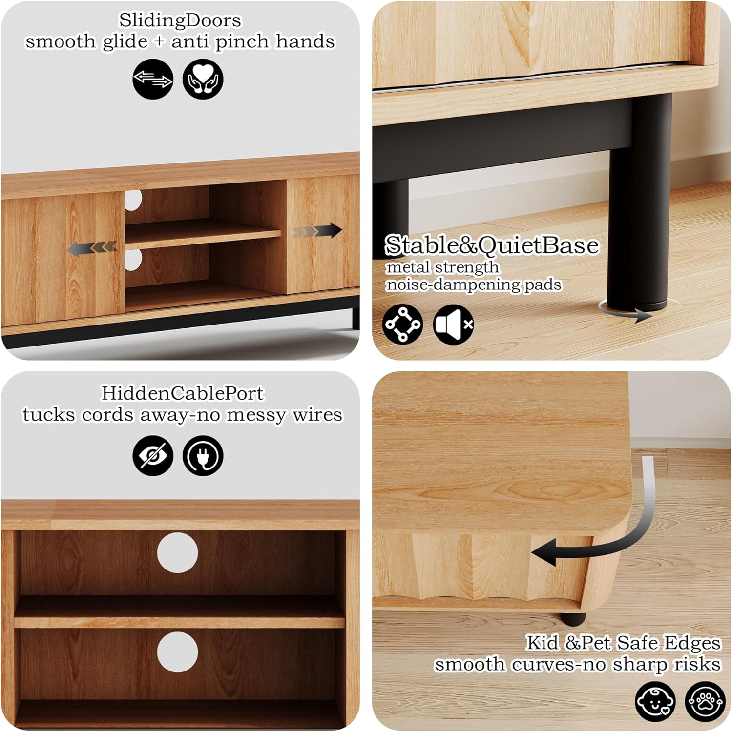 - BUILT FOR 32–75" SCREENS - Anti-tip steel frame and soft-grip silicone feet lock the console in place, this stand works seamlessly with 55 60 65 70 75 inch TVs while keeping floors scratch-free and every movie night rock-steady. Whether in the living room or bedroom, it adapts to various spaces, meeting diverse needs of modern homes