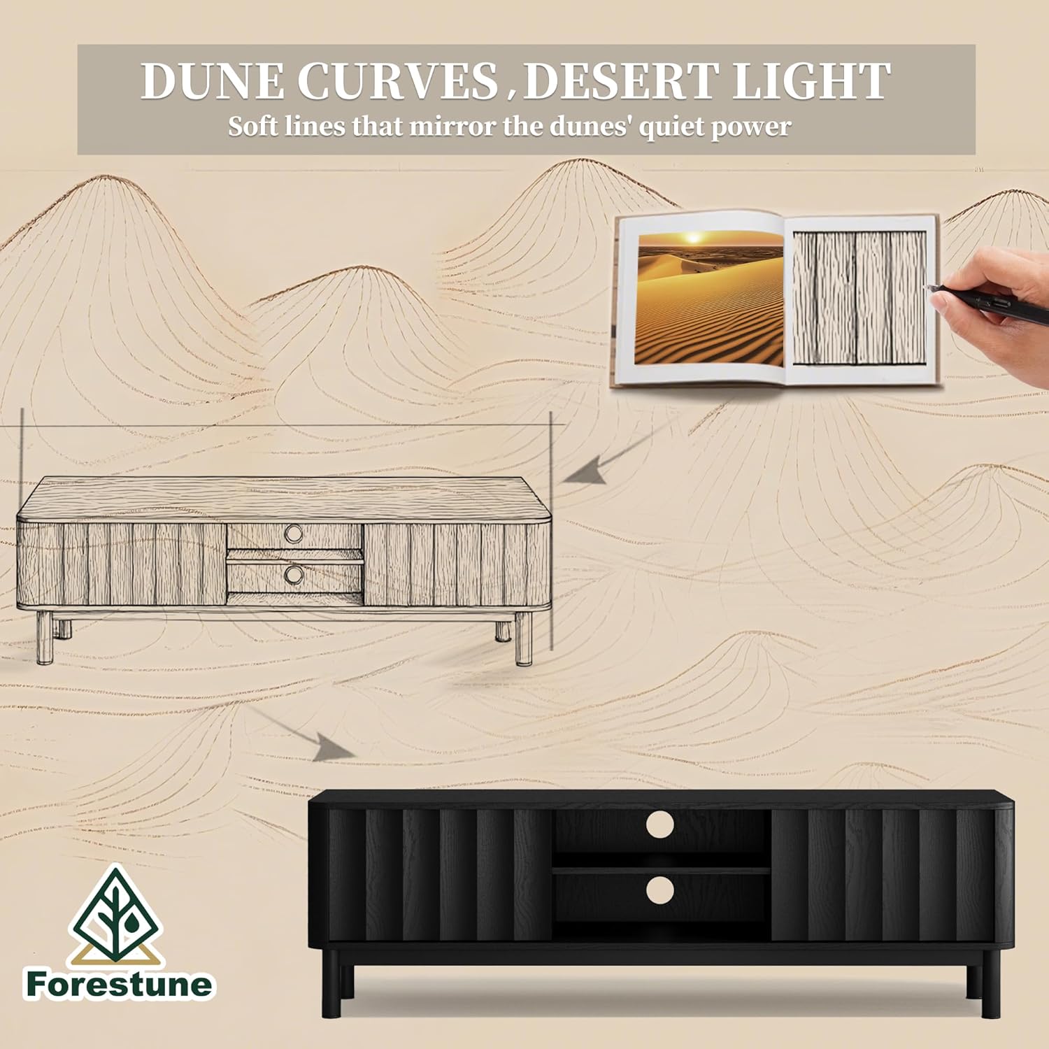 - DESERT-INSPIRED FLUTED DESIGN - The Forestune black TV stand channels the quiet power of sand dunes with soft, sculptural ridges that catch and diffuse light, turning your living room into a calming retreat with mid-century modern soul