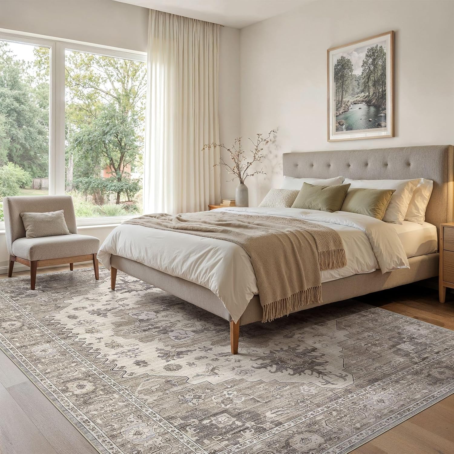 Washable Area Rugs for Living Room -7x10 Neutral Vintage Distressed Floral Farmhouse Boho Large Soft Floor Rug Indoor Non Slip Carpet for Living Room Bedroom Dining Room Office-Brown/Beige